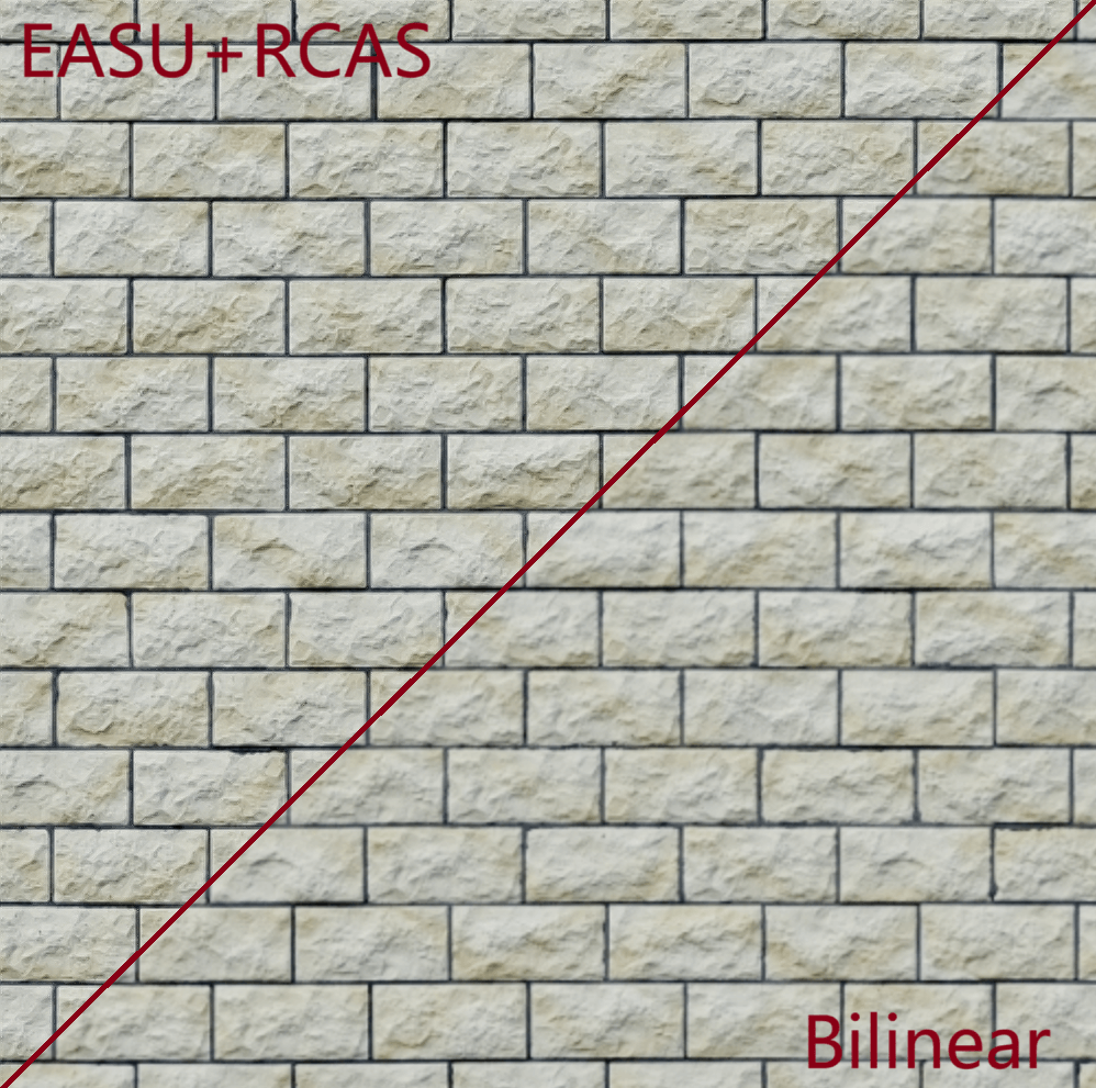完整复现AMD的单帧自适应锐化方案FSR1.0。边缘适应空间上采样 + 对比度适应锐化。整体观感稍强于硬件双线性插值。