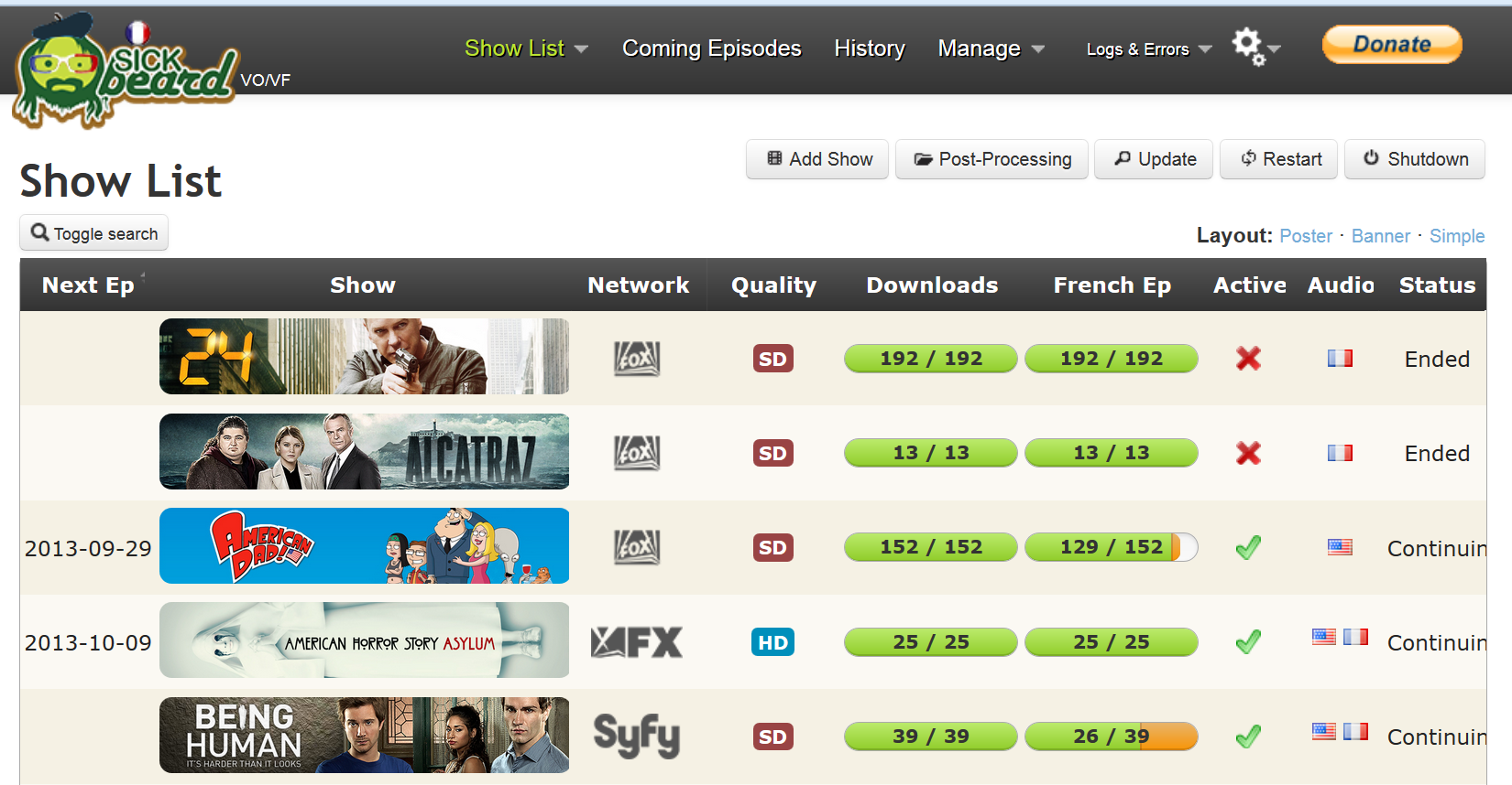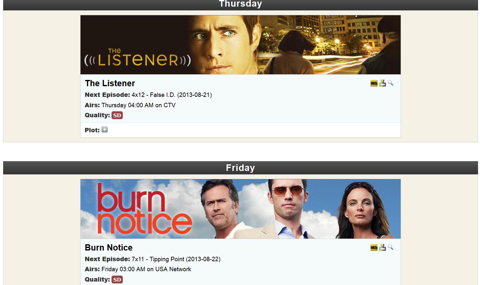 Sick Beard is a PVR for newsgroup users (with limited torrent support). It watches for new episodes of your favorite shows and when they are posted it downloads them, sorts and renames them, and optionally generates metadata for them. It currently supports NZBs.org, NZBMatrix, Bin-Req, NZBs'R'Us, EZTV.it, and any Newznab installation and retrieves show information from theTVDB.com and TVRage.com.