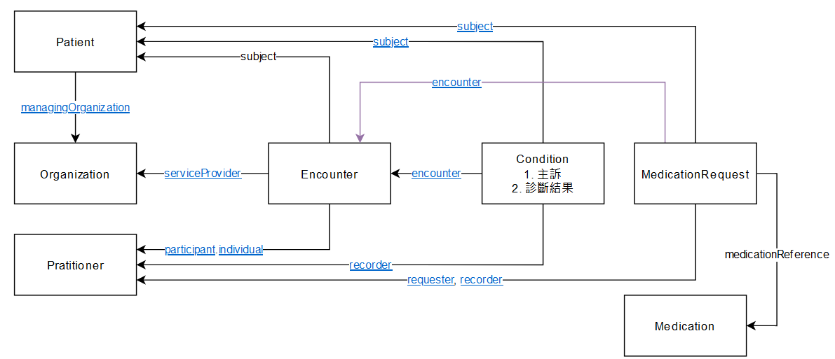 在演練 4 中,我們將原始的病歷資料進行分類,找出各部資料所屬的 FHIR Resource,並以 draw.io 等工具繪製成關聯圖。