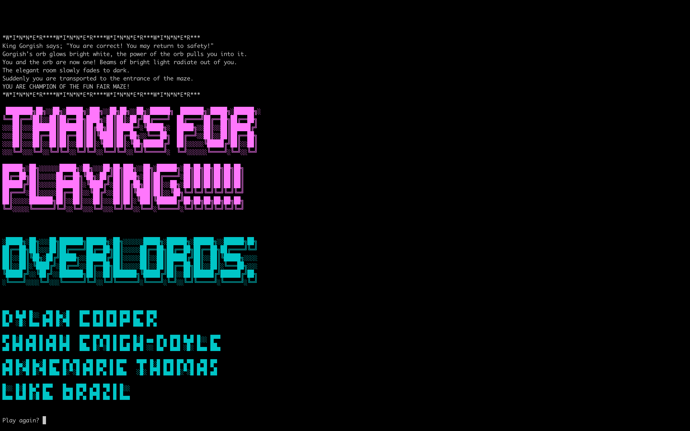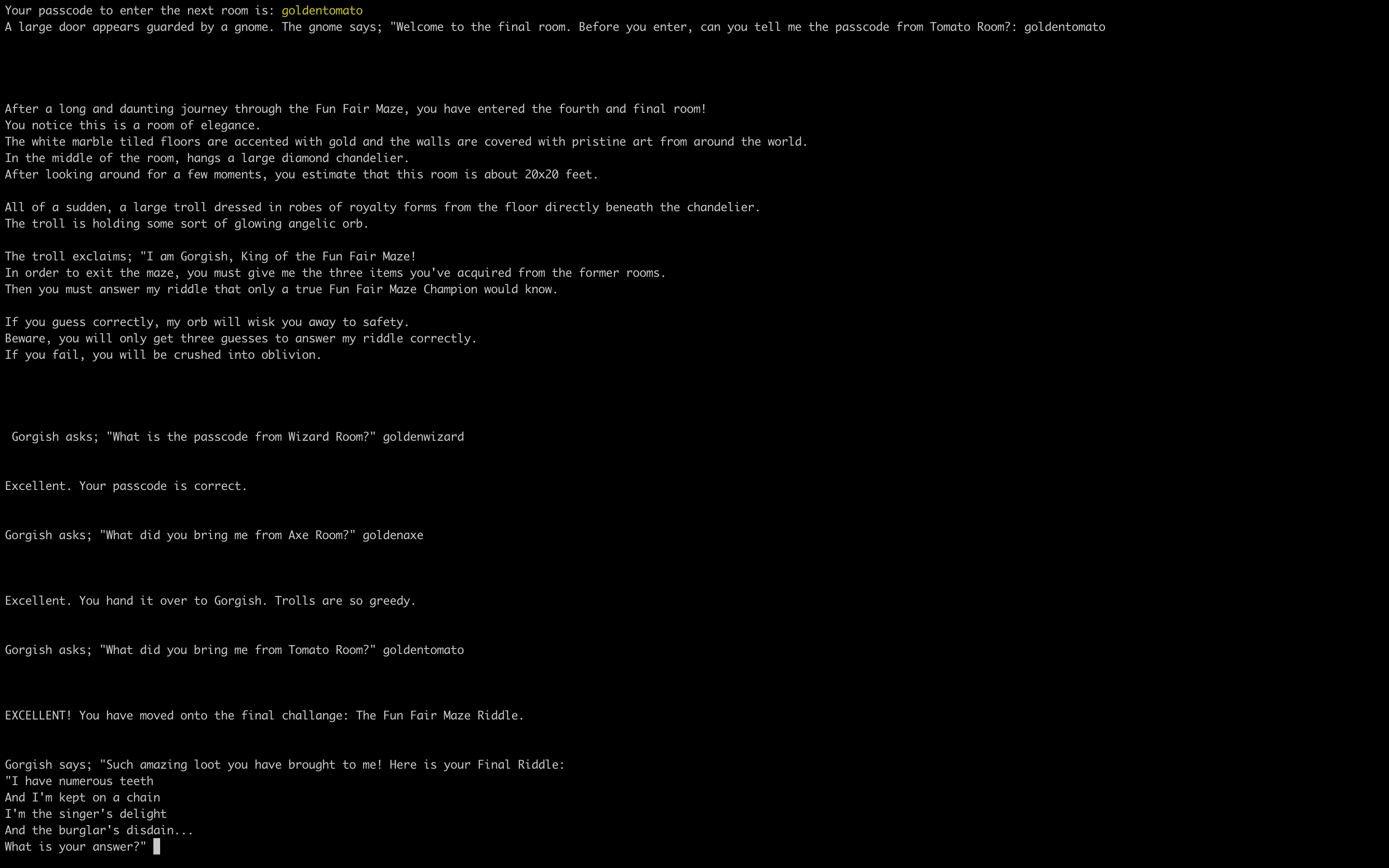Fun Fair Danger is a text based terminal game that gives you challenges as you move through a 4 part maze.