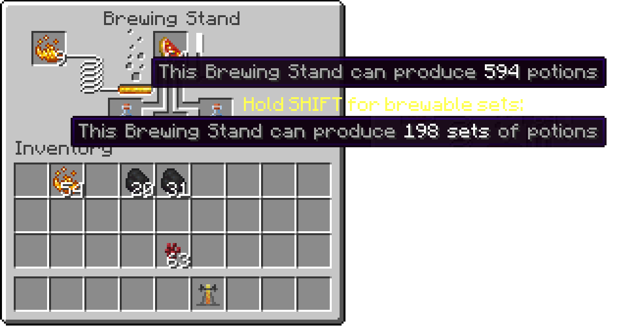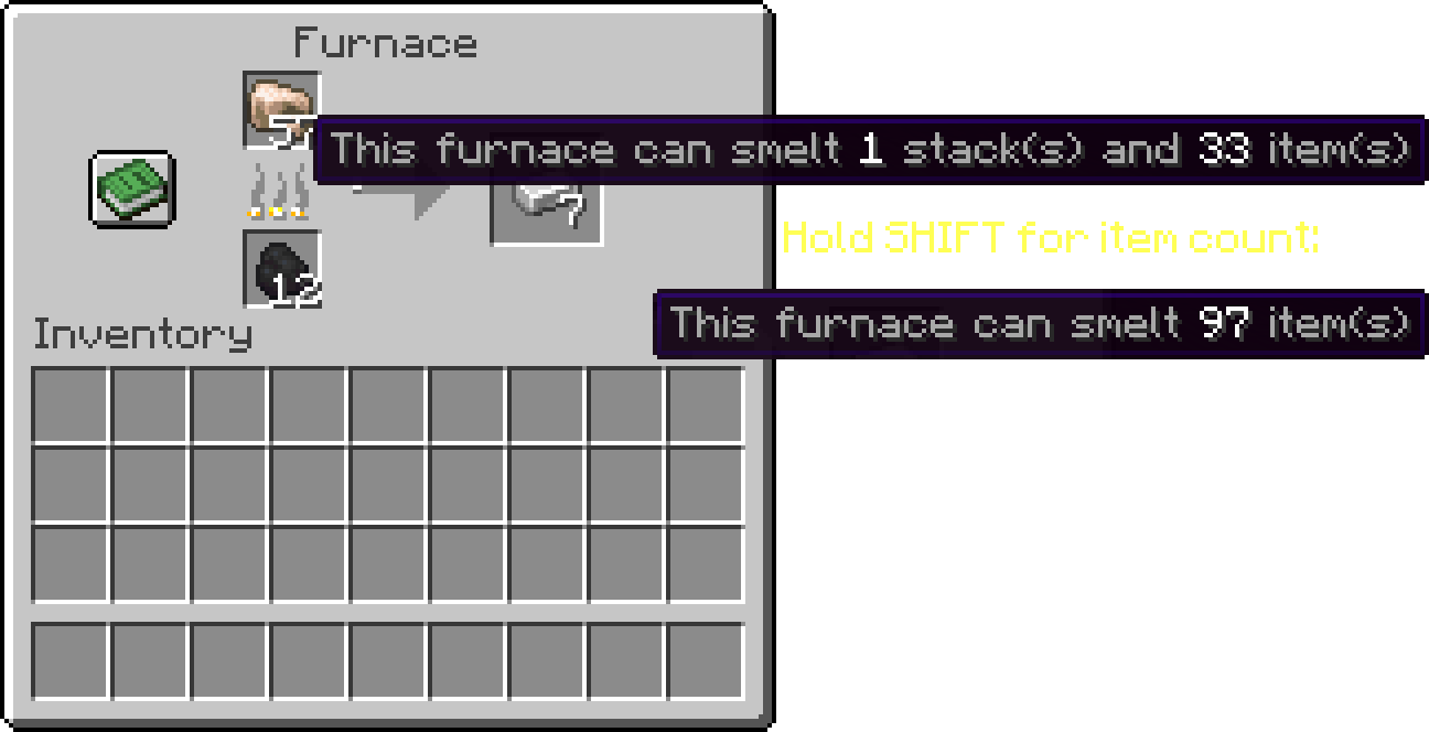 FuelInfo displays extended info on vanilla Furnaces (including its variants) and Brewing Stands, such as how many items can be smelted, time remaining and how many (sets of) potions can be brewed.