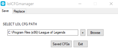LoL Config Manager Easiest way how to Save / Replace cfgs cfg save path == (\League of Legends\Config\Saved CFGs) Every LoL Acc has its own config == You need to log in first