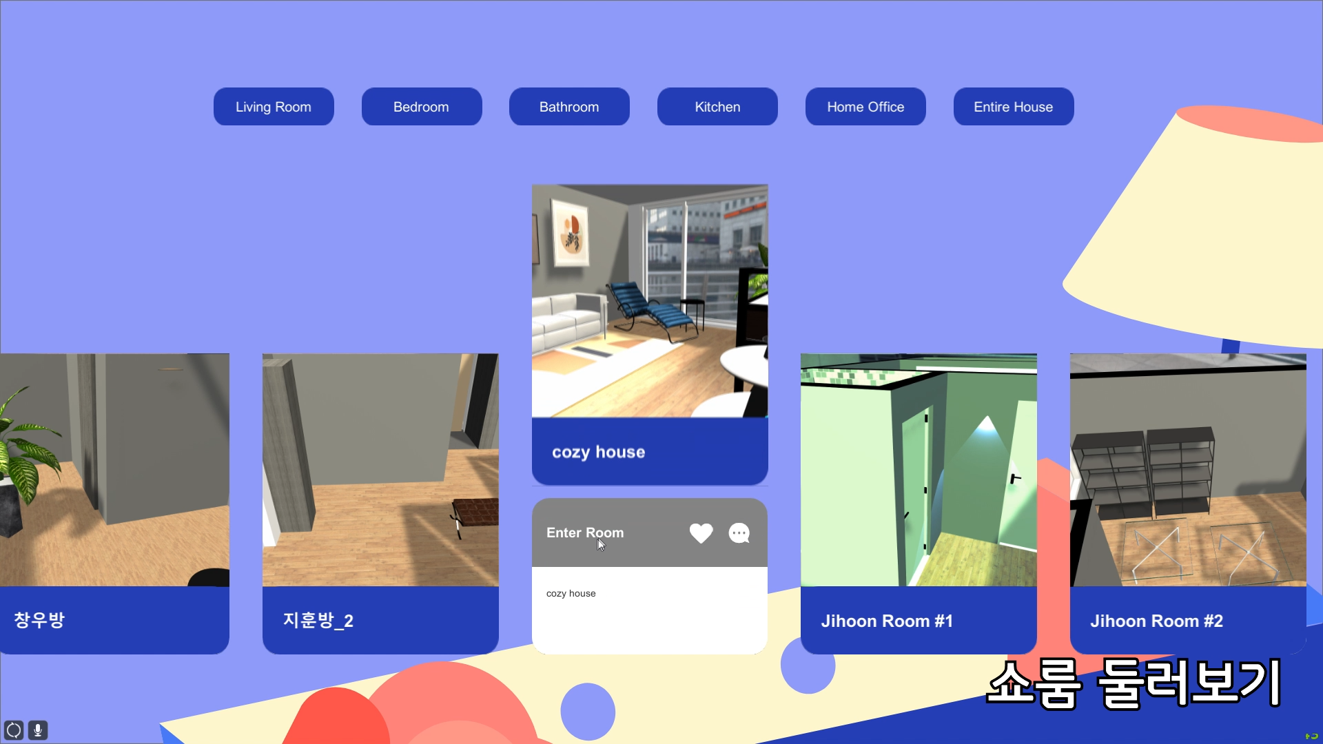 유저가 가구 모델링을 서버에 업로드하고, 남들이 업로드 한 가구를 사용해 방을 배치해보고 그 방을 업로드하는 인테리어 전용 메타버스 플랫폼입니다.