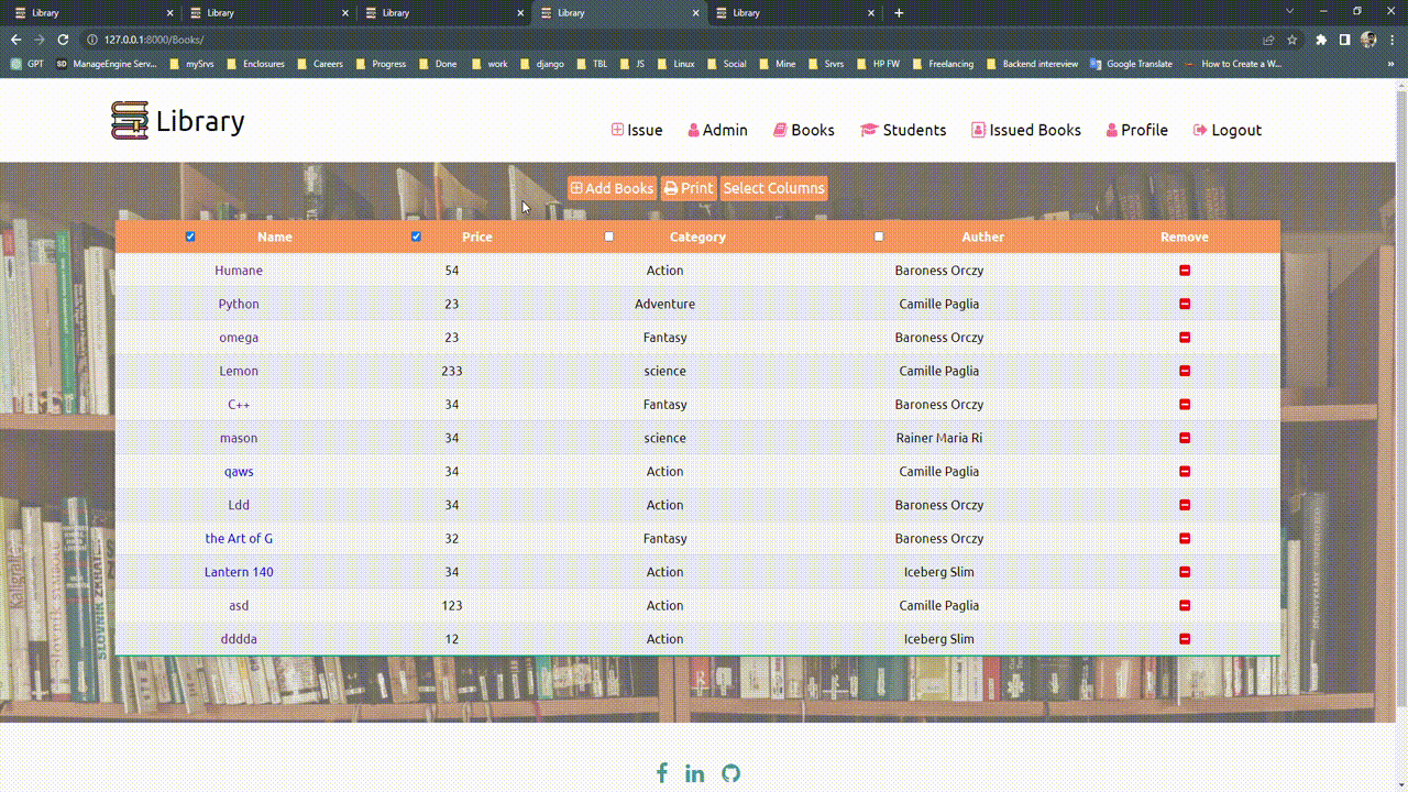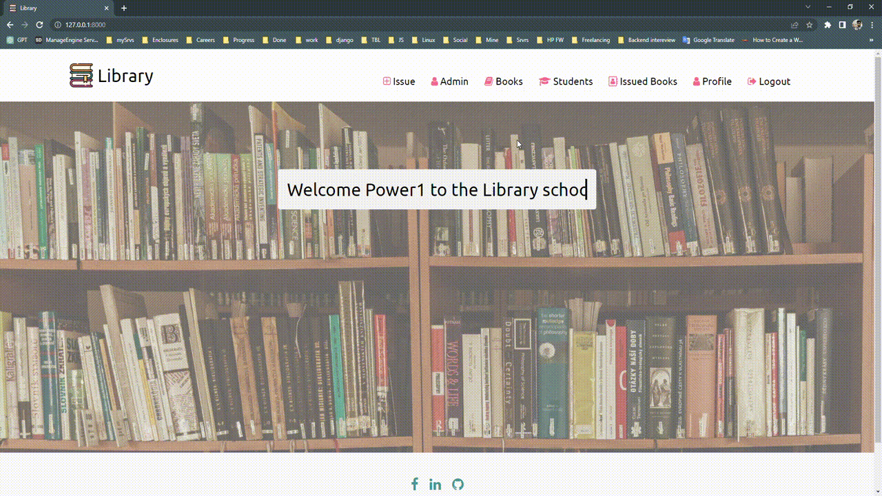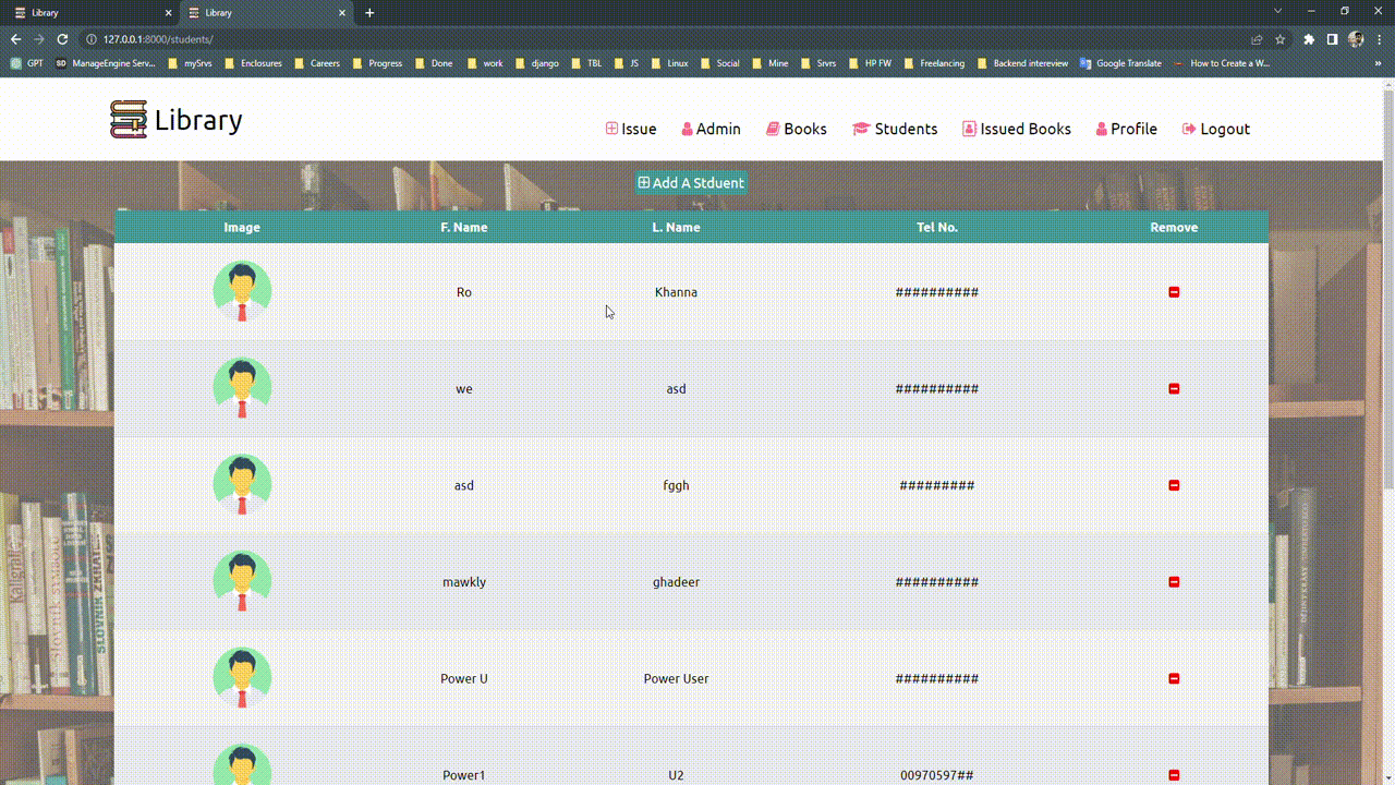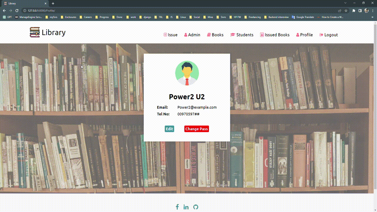- Authorization: The project includes user authentication and authorization. There are two types of users: Admin and Normal users. -Admin users have the following capabilities: -Issue books to students -View available books -Edit and delete available books -View all students -Edit and delete student records -Normal users have the following capabilities: -View their own issued books -Edit their own Profiles