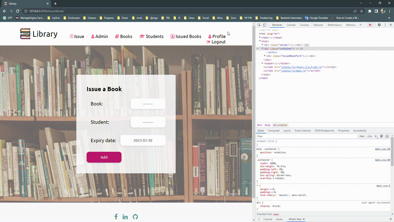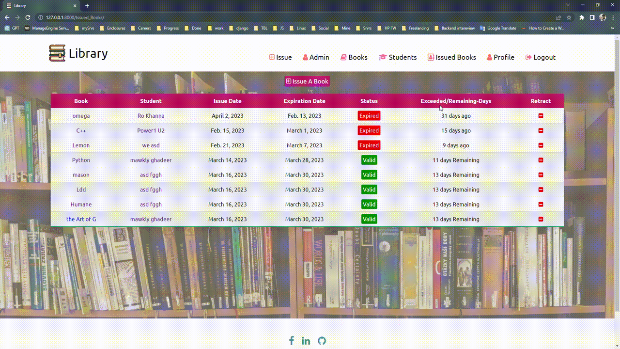 The Library App is a web-based application designed to facilitate the work of librarians. It allows the librarian to issue books to students and specify the expiration date automatically by the system. The application maintains a table that contains all issued books with their respective students, including their status as valid or expired.