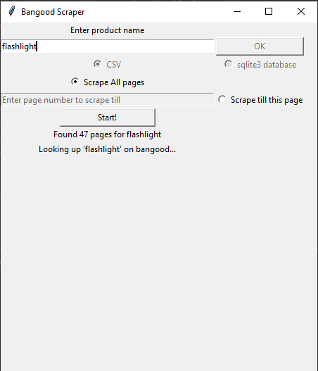 After you hit OK, the script will make contact with bangood.com for the given search term. It will display the number of pages it found. Then choose if you want to scrape all the pages or only upto a specific page number. Make sure the number you enter is less than the total pages!