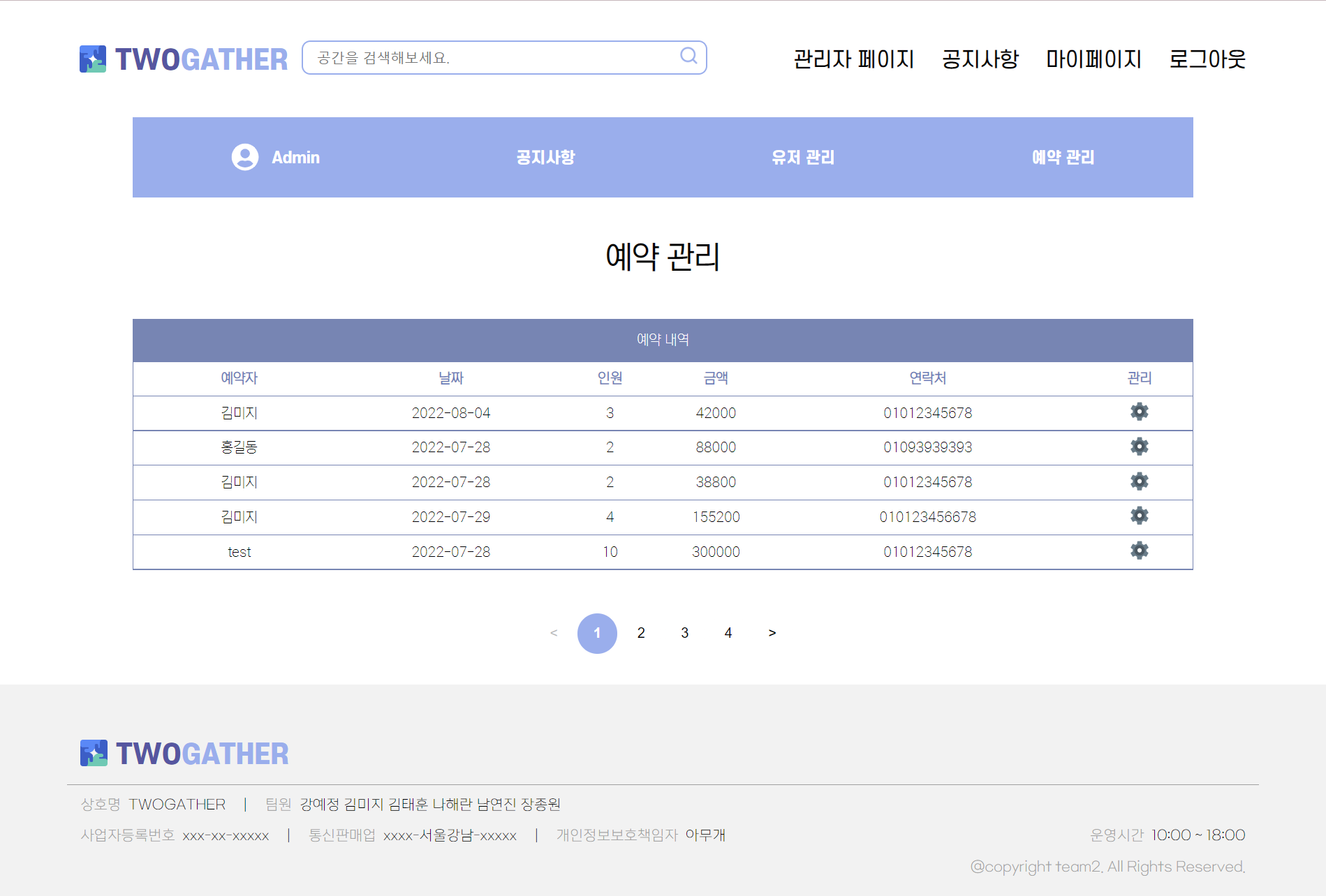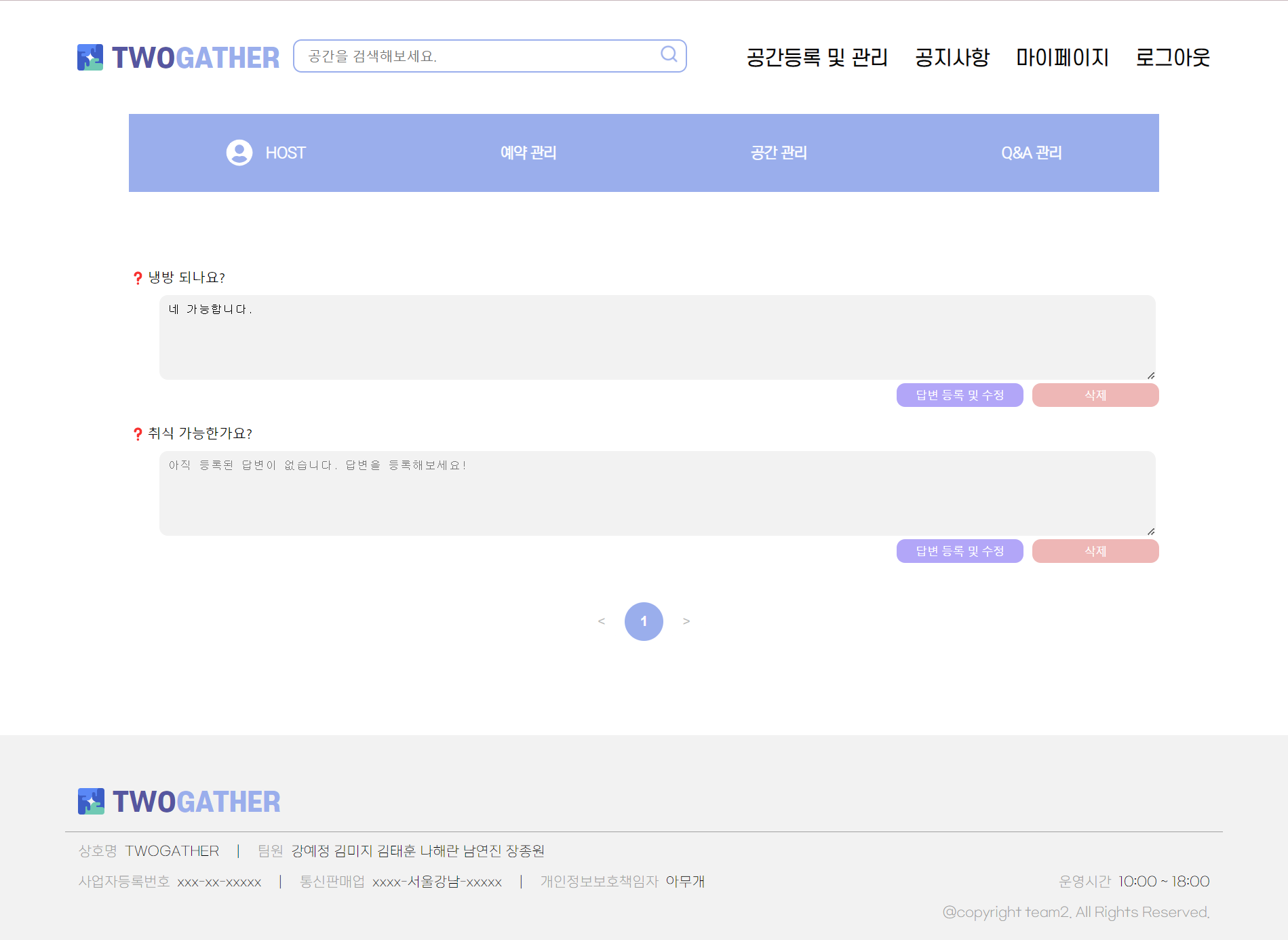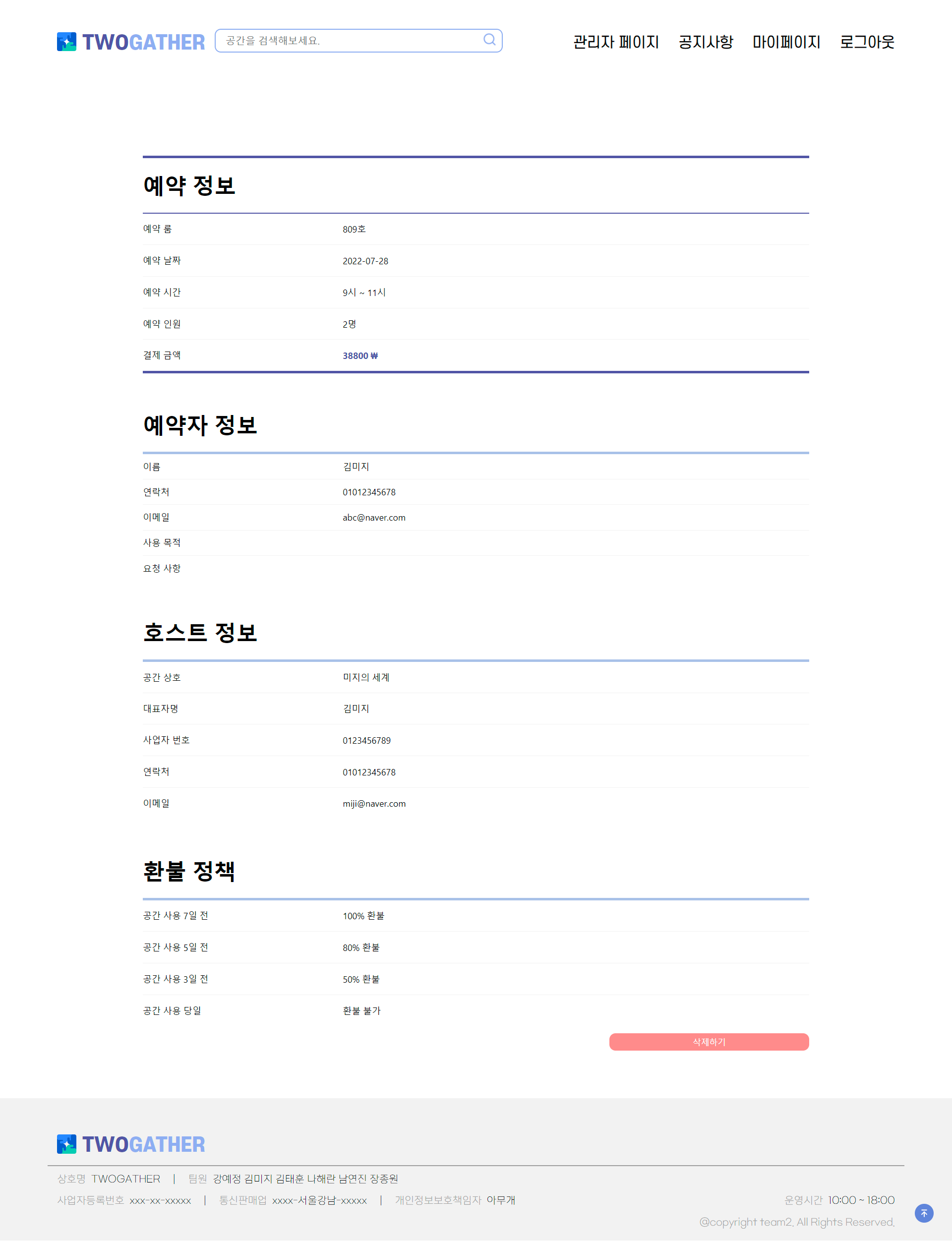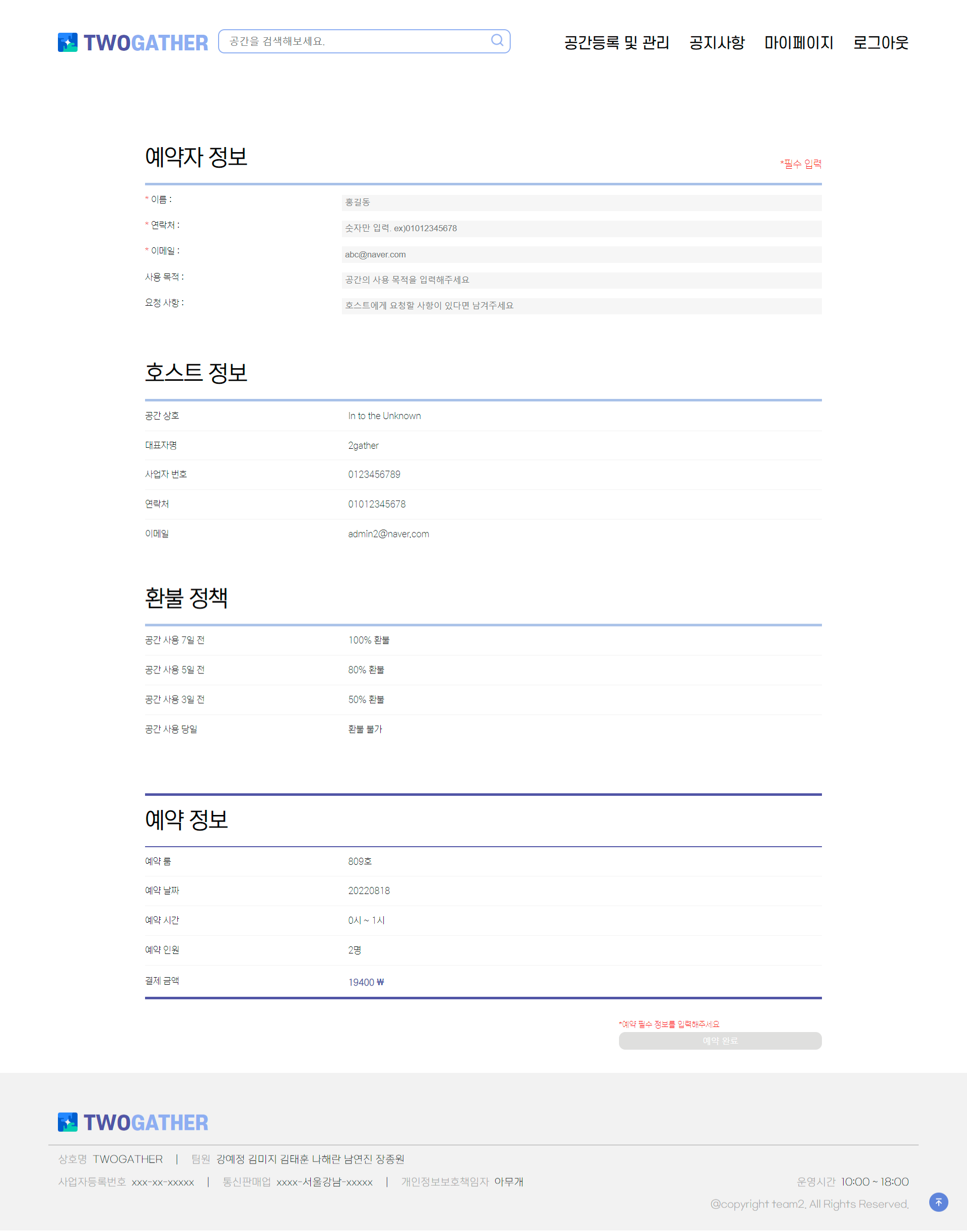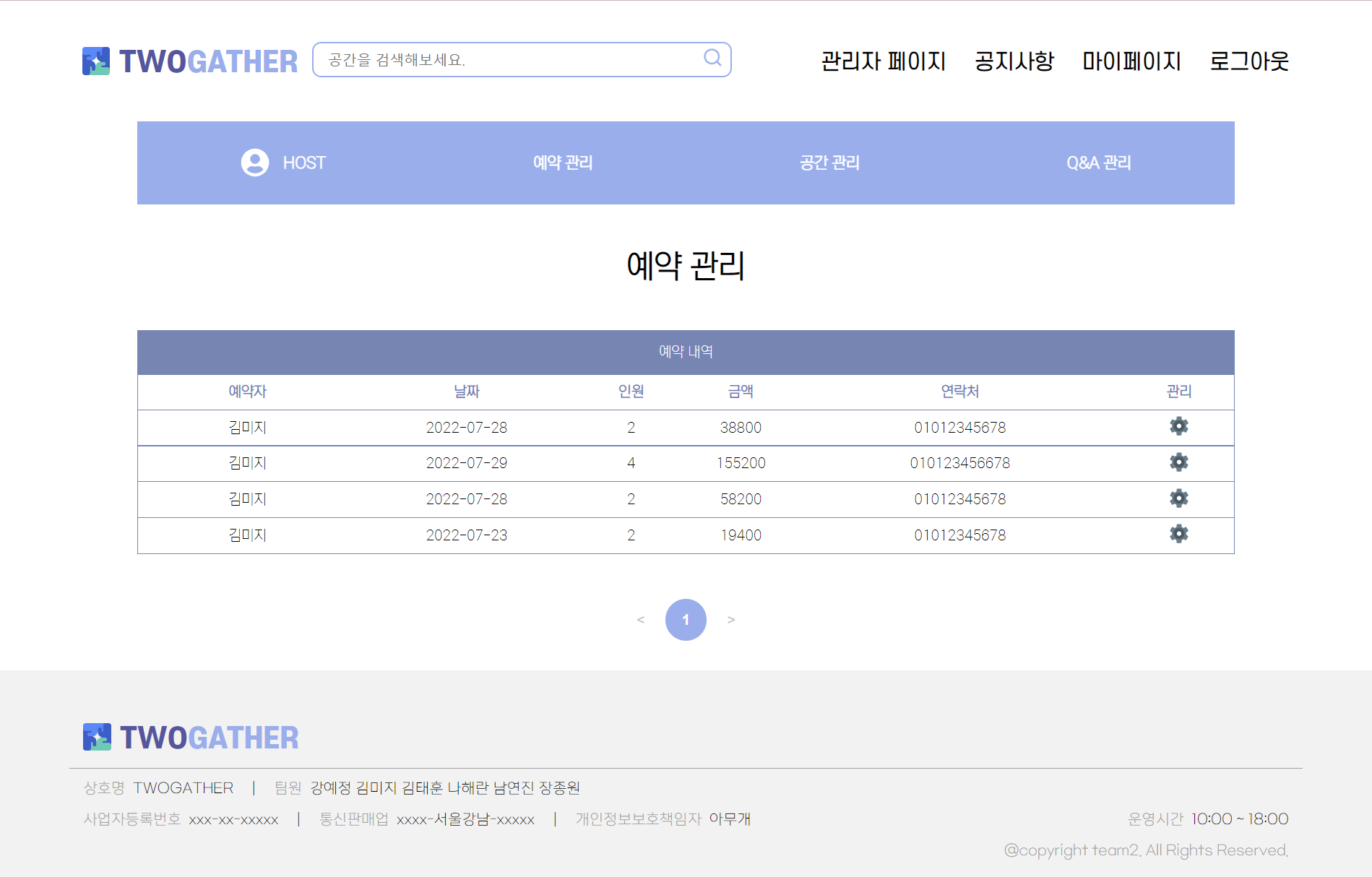 | 김미지 | 프론트엔드 | 공간 상세, 공간 예약, 호스트/어드민 예약관리, 호스트 Q&A 관리, 해시태그 |