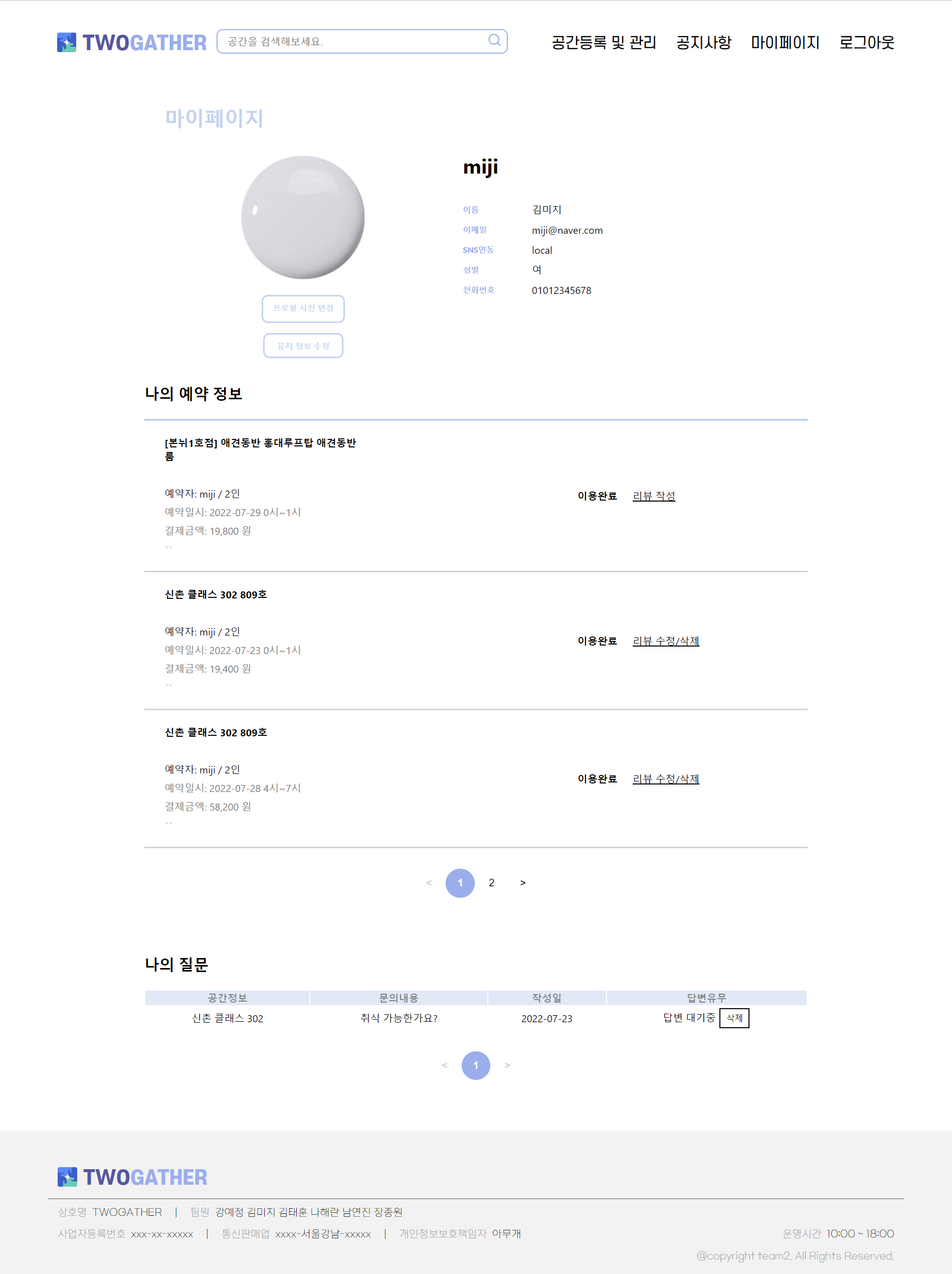- 마이 페이지에서 나의 정보와 예약내역, Q&A, 리뷰를 조회/등록/수정이 가능하다.