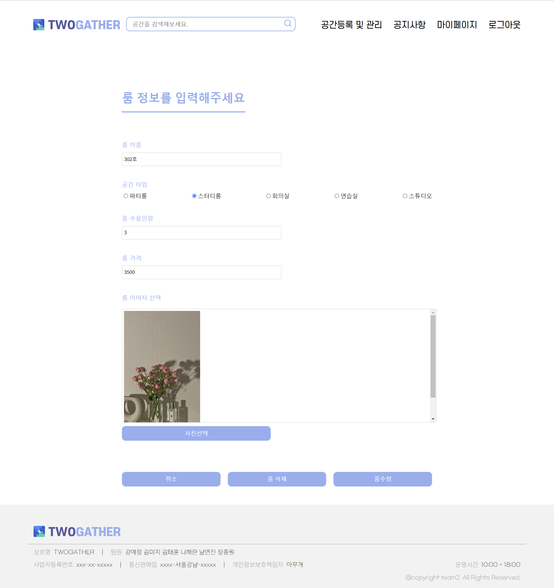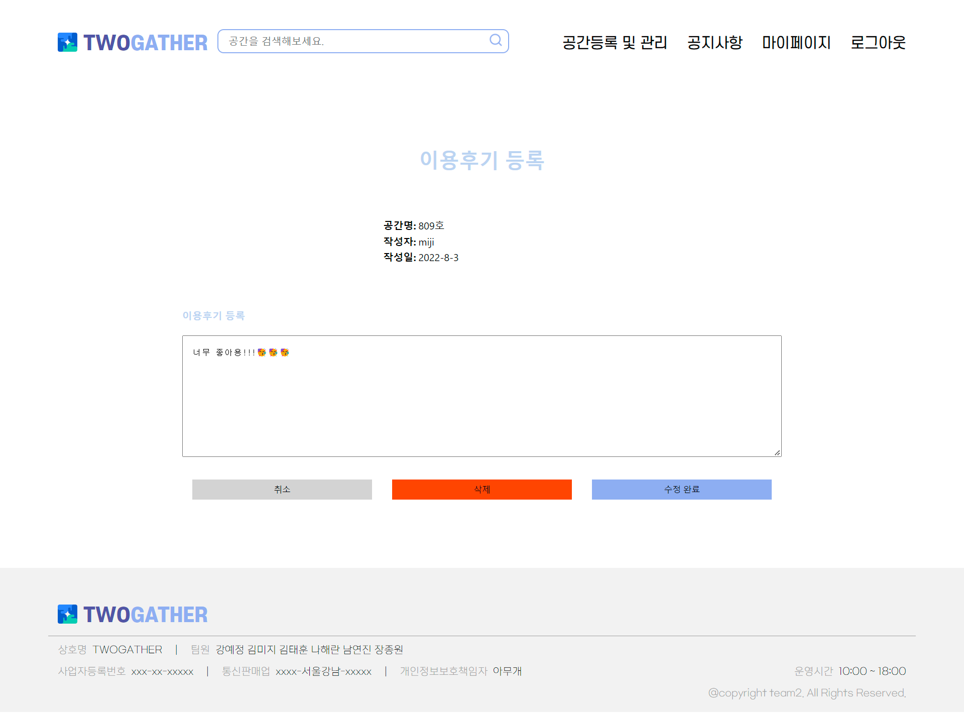 | 나해란 | 프론트엔드 | 홈, 공간 목록, 공지사항 CRUD, 공간 해시태그 검색 |