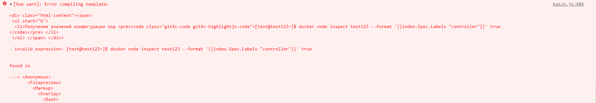 Hi, I have problem with performance README.md from GitLab repository because it contains string below: [test@test123~]$ docker node inspect test123 --format '{{index.Spec.Labels "controller"}}' true