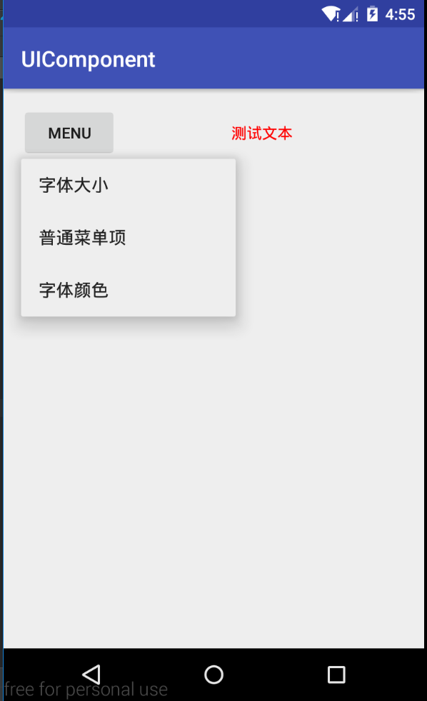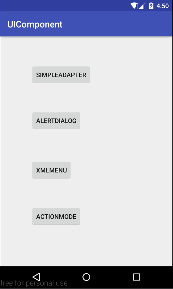 #实验3 UI组件 #主activity三个按钮,点击进入对应的组件 ##点击SIMPLEADAPTER显示 如图所示 点击任意一项 出现短暂toast提示所选项内容 ##点击ALERTDIALOG显示 ##点击XMLMENU显示菜单项页面 如图所示,选择菜单项调整文本字体颜色大小 ##ACTIONMODE展示 长按转换actionmode模式