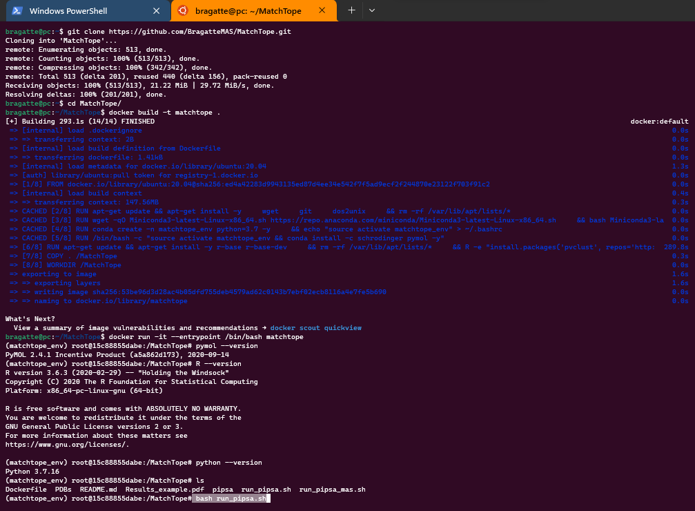 docker run -it --entrypoint /bin/bash matchtopeThis command mounts the PDBs folder from your local machine to the container and sets up a Results folder for the output.