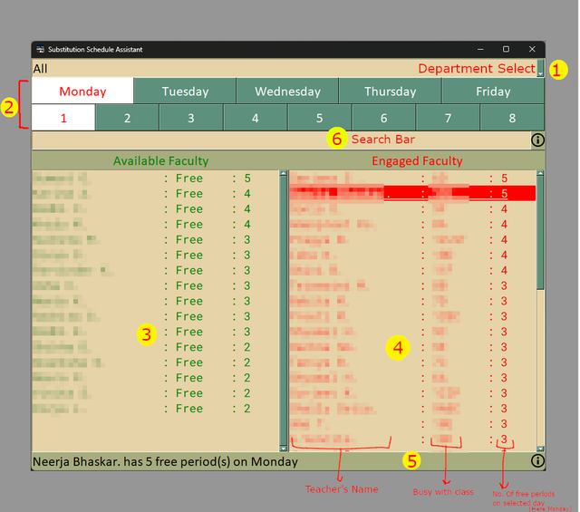 (6) : Search Bar : Search for teachers by name / class / number of free periods /is Free?/is Unavailable?