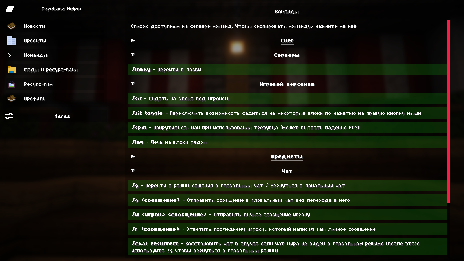 В моде можно посмотреть команды и рекомендованные моды для игры на сервере(от меня).
