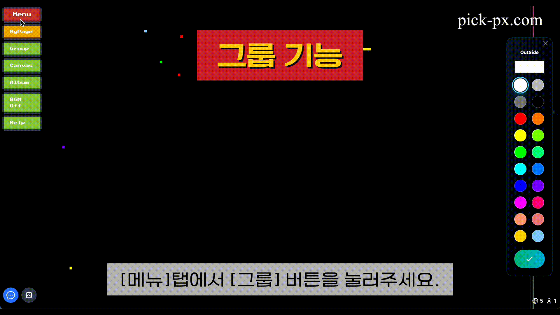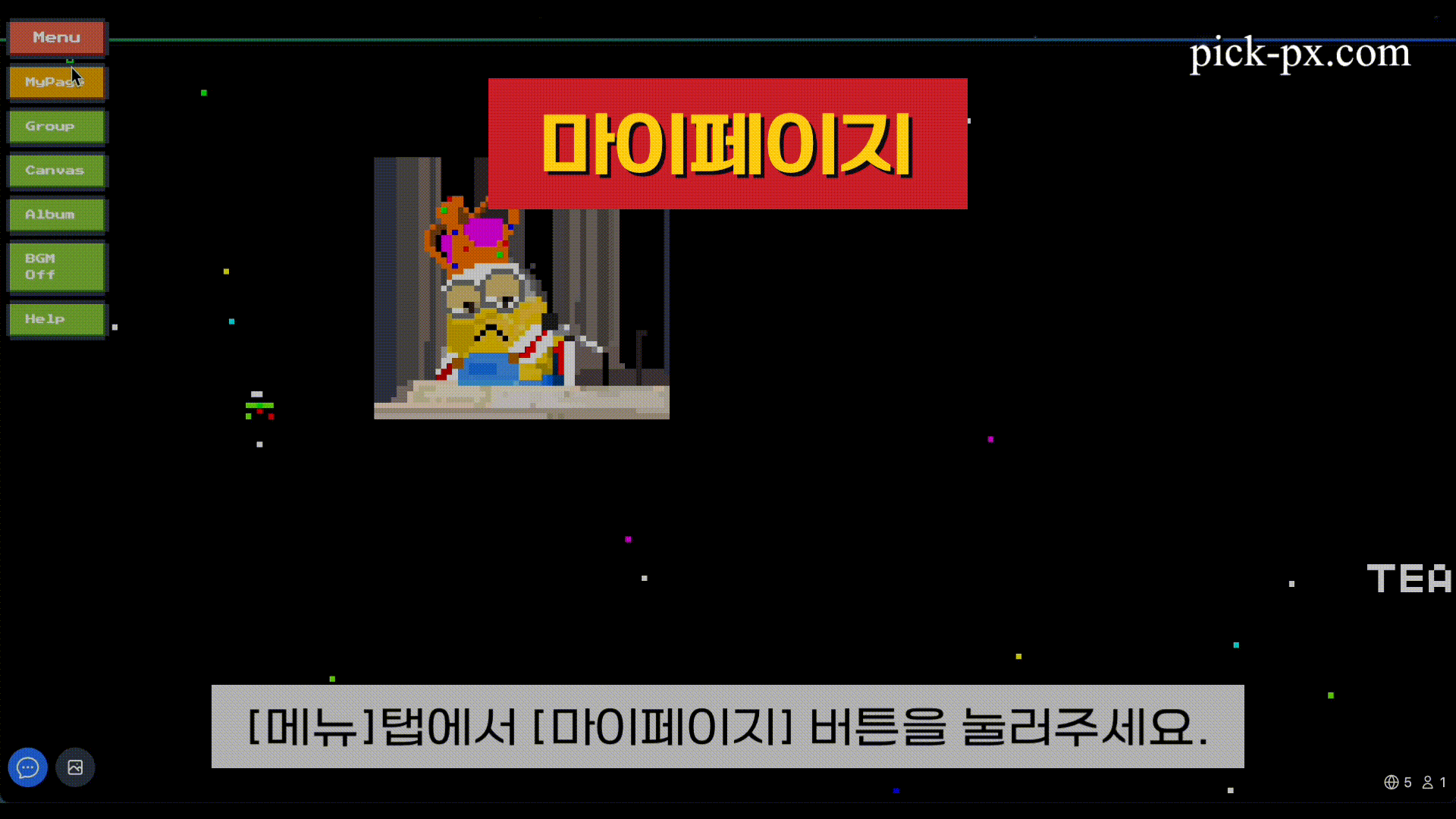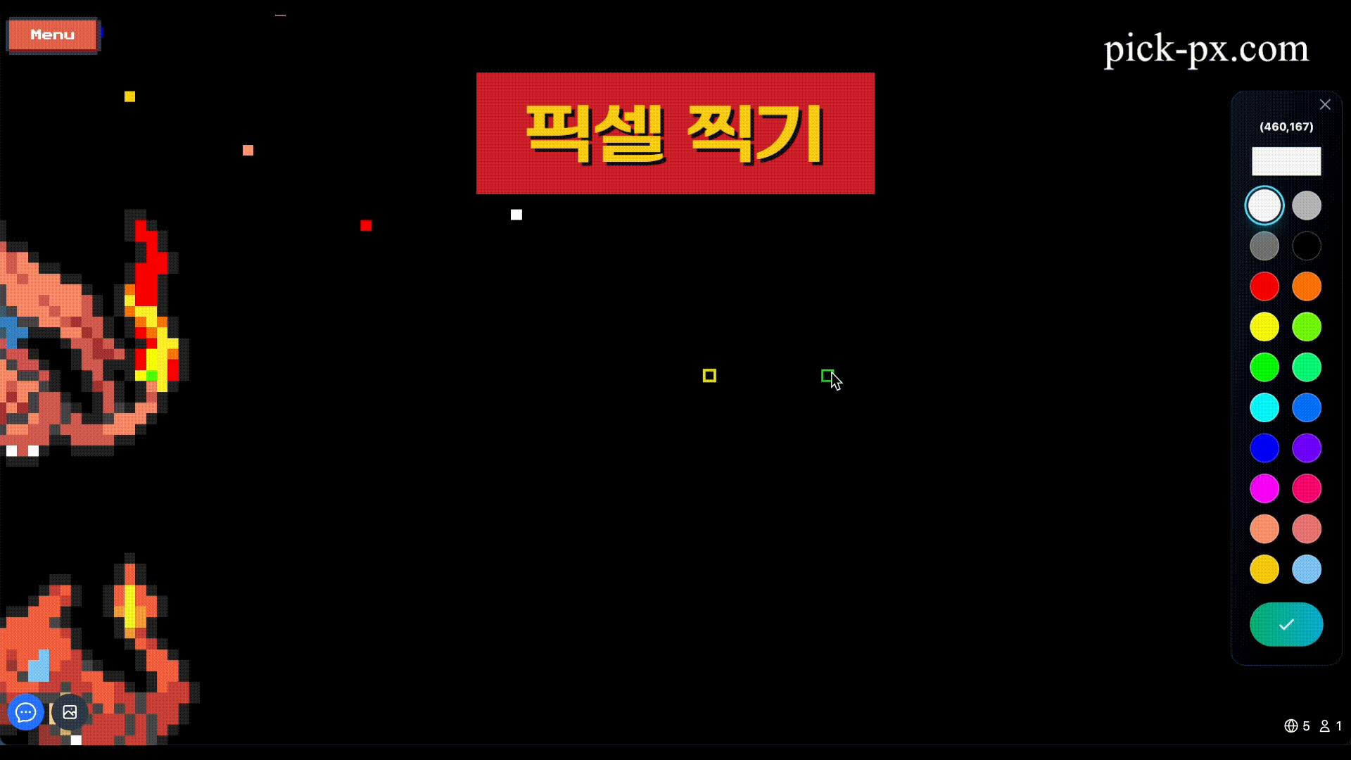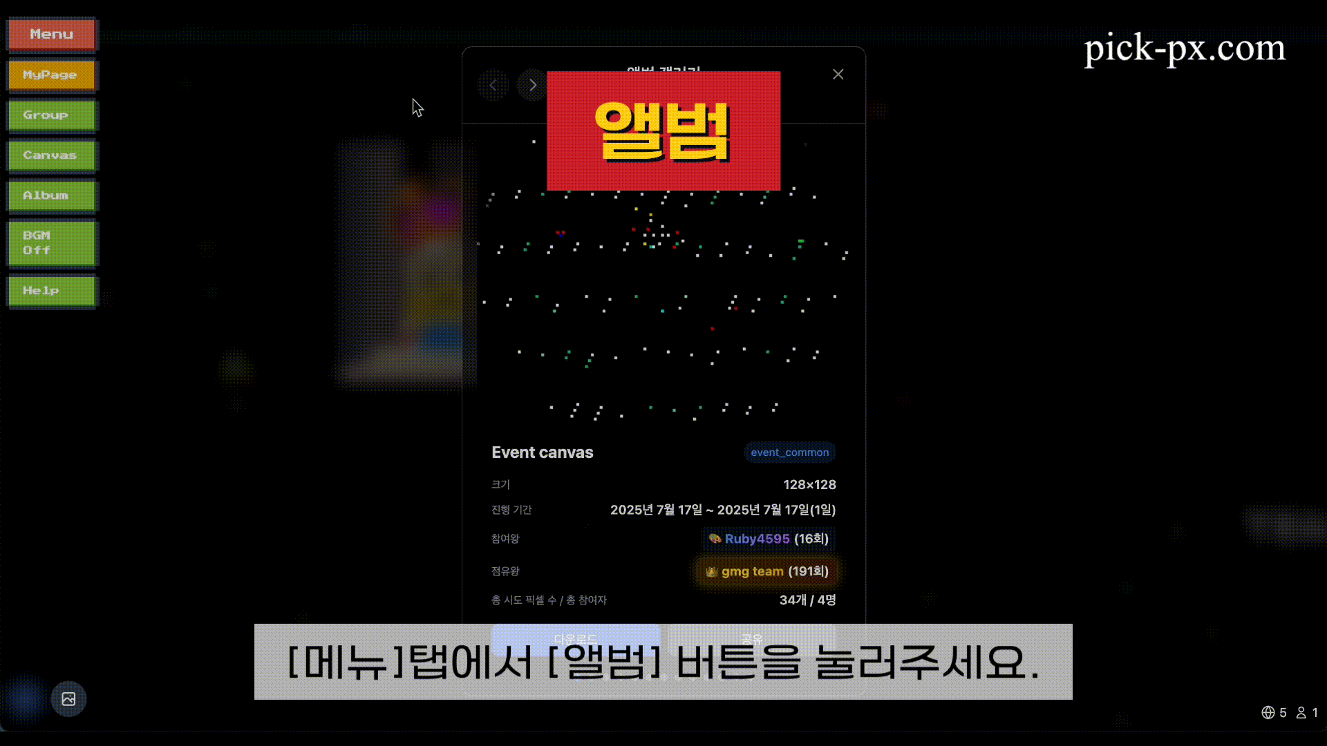 Pick-Px는 사용자들이 실시간으로 함께 픽셀 아트를 그릴 수 있는 협업 플랫폼입니다. 캔버스 공유, 실시간 채팅, 게임 모드 등 다양한 기능을 제공합니다.