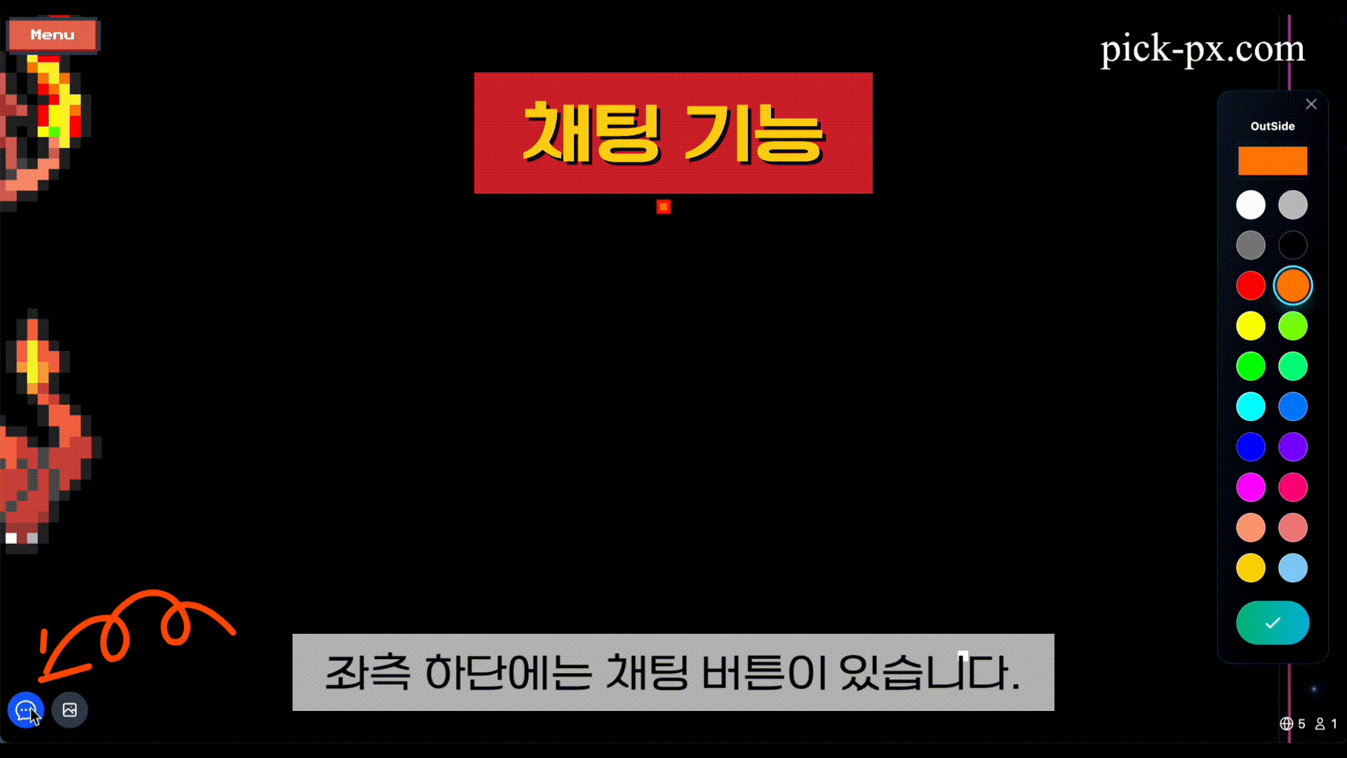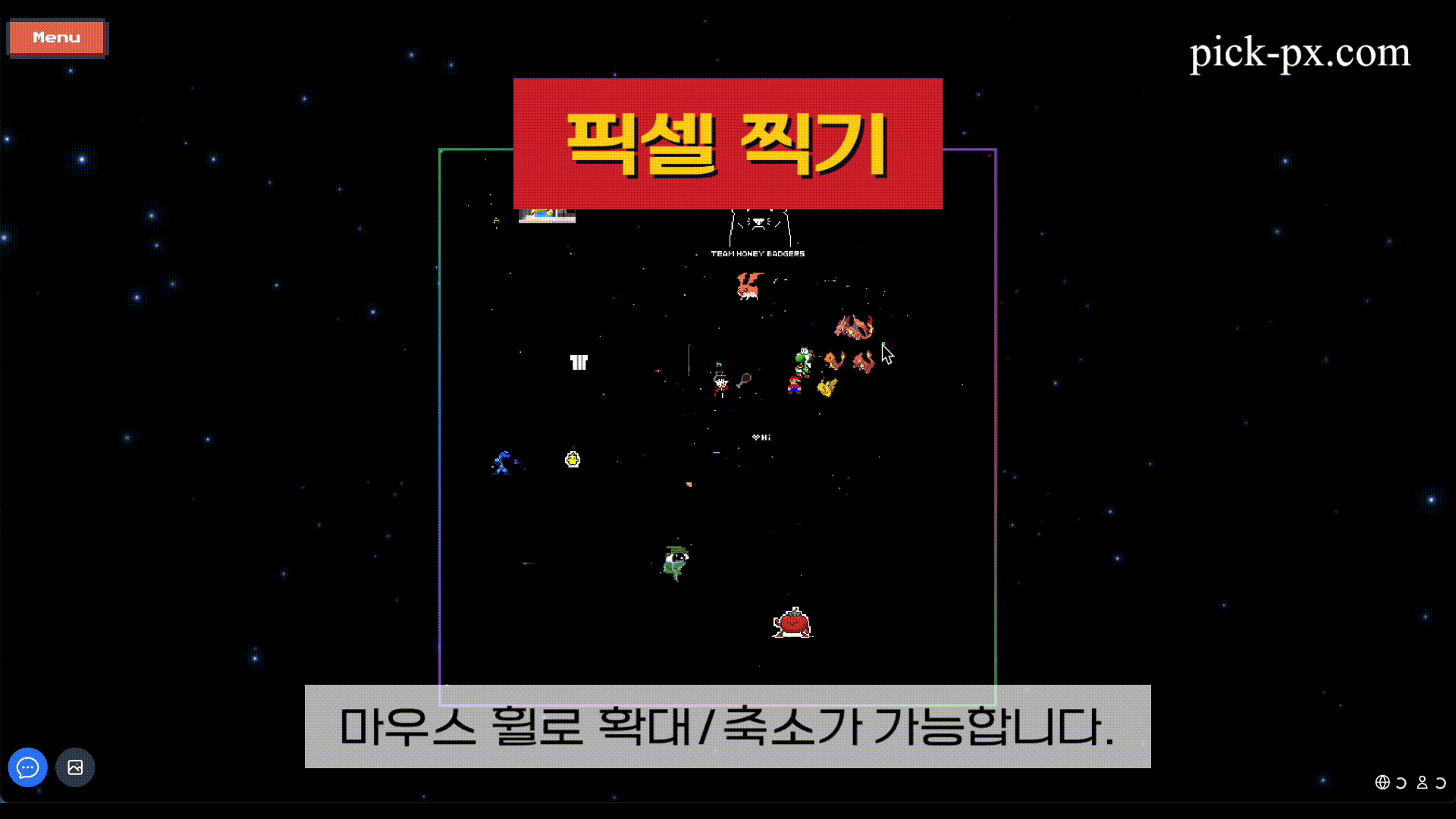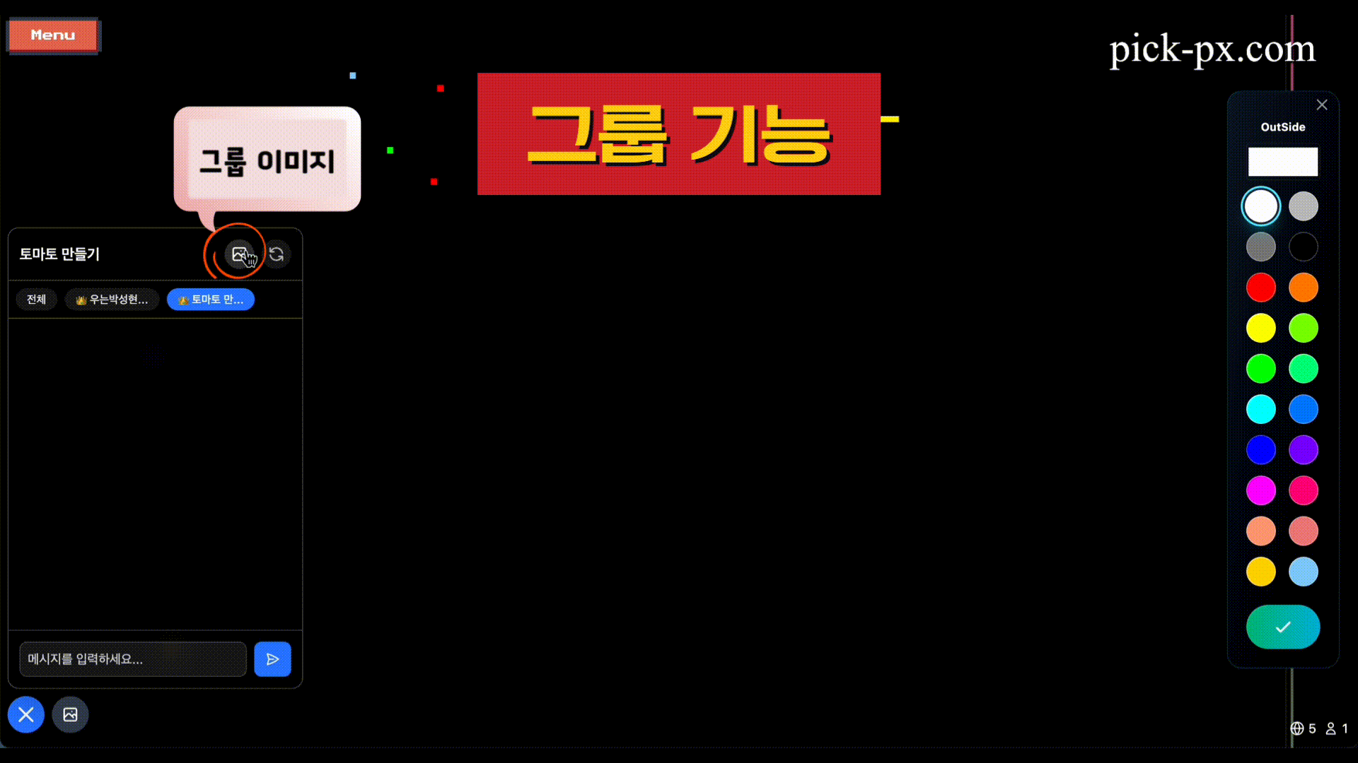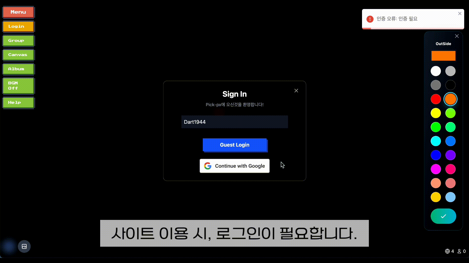 Pick-Px는 사용자들이 실시간으로 함께 픽셀 아트를 그릴 수 있는 협업 플랫폼입니다. 캔버스 공유, 실시간 채팅, 게임 모드 등 다양한 기능을 제공합니다.