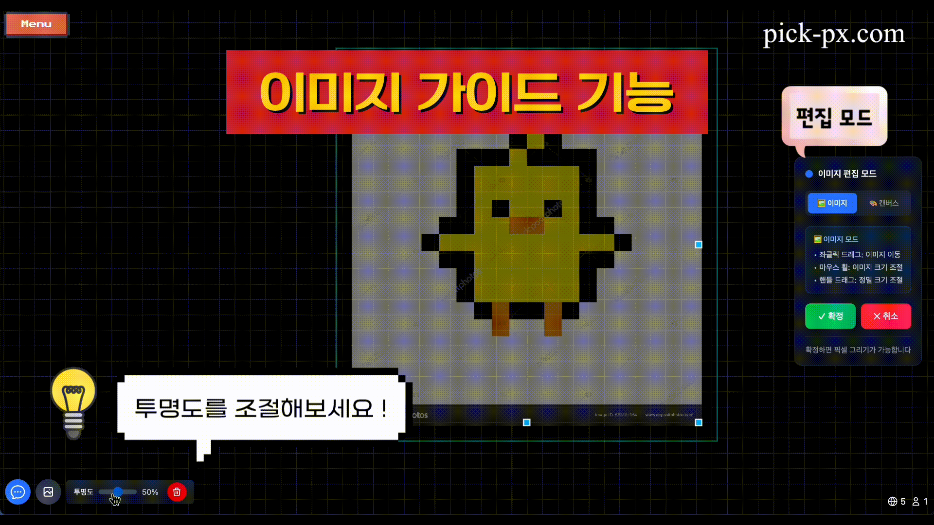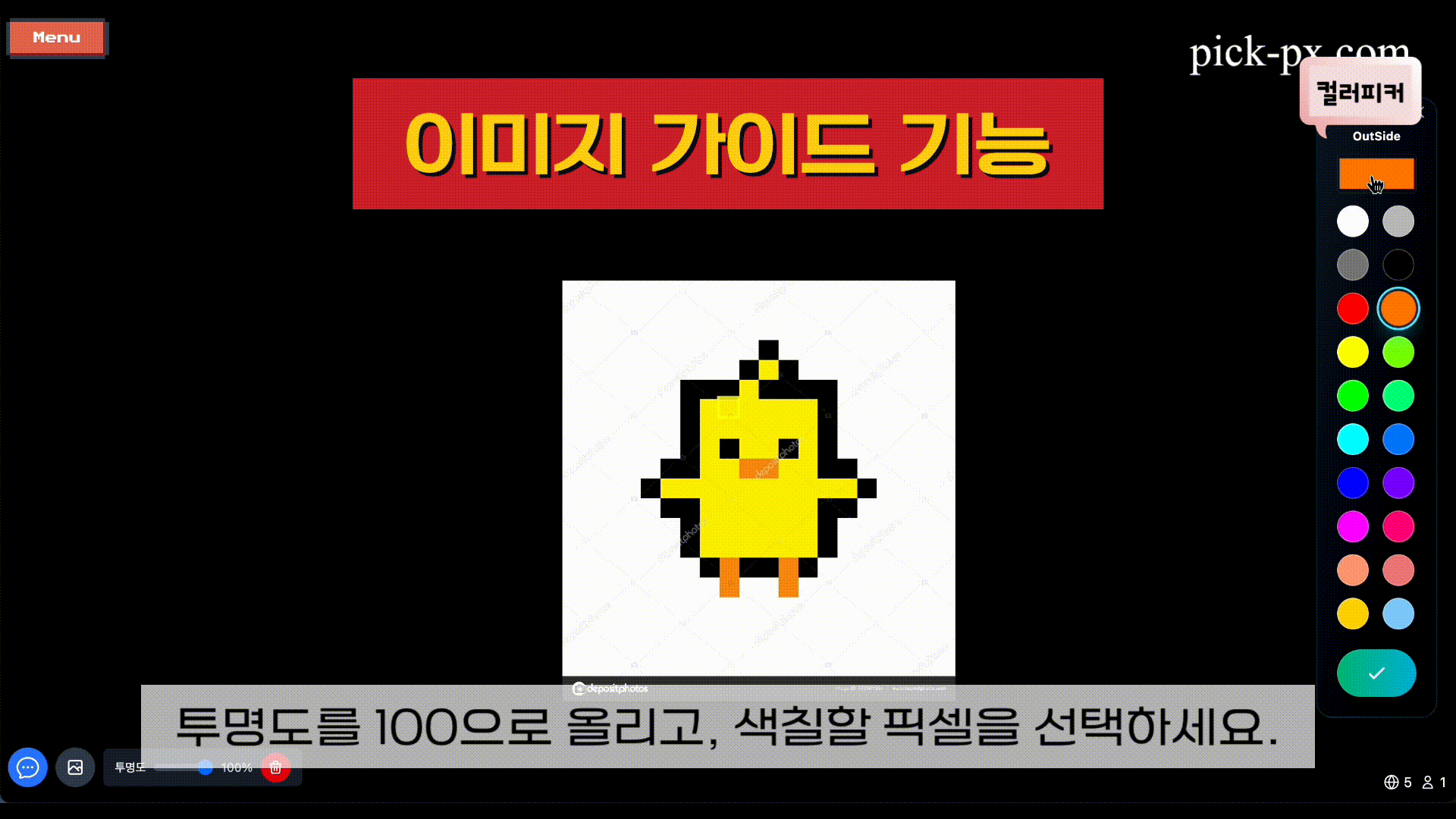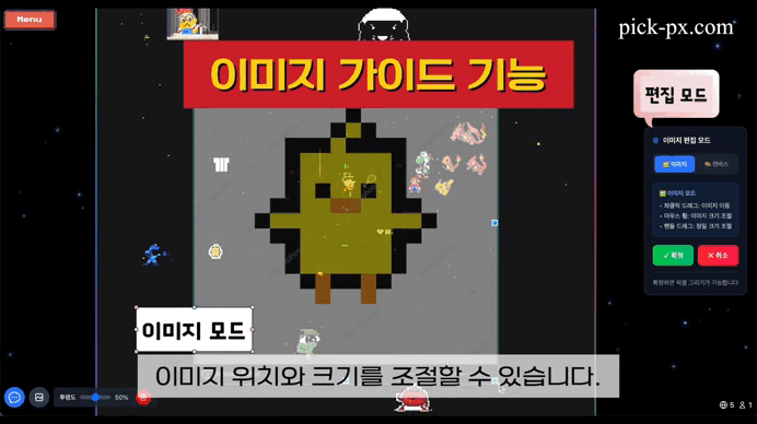 픽셀 아트로 그리고 싶은 이미지를 더 쉽게 완성할 수 있도록 이미지 가이드 기능을 제공