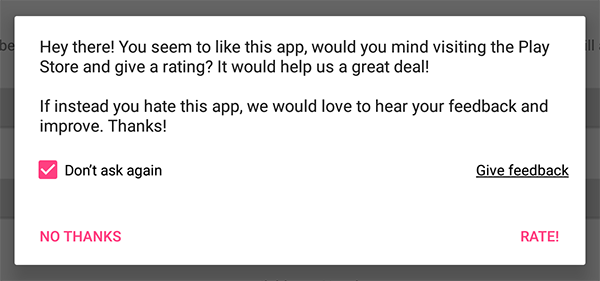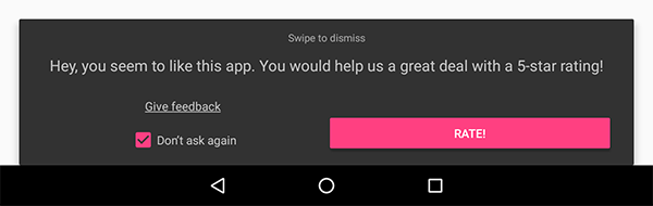 rate.showRequest();That's the gist of it! That bit of code will show a dialog when the time is ripe. Personally though, we prefer showing a SnackBar instead - it's a lot less intrusive! To show the SnackBar instead of the dialog simply call the following on the builder: