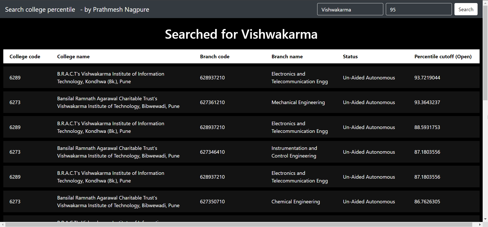 Search college by keyword 'Vishwakarma' and 95 percentile