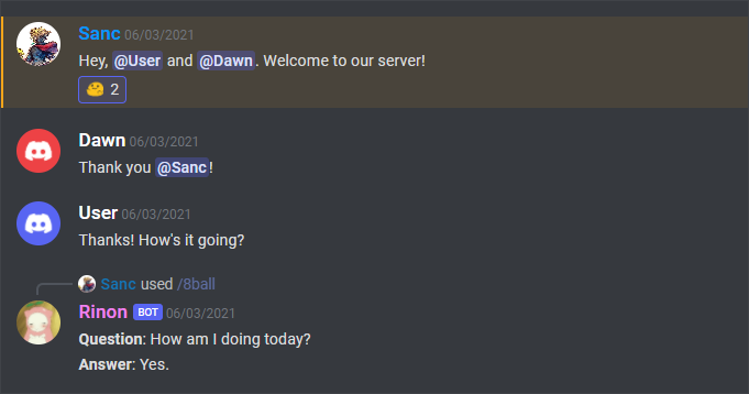 - Components for buttons, embeds, markdown, mentions, reactions, replies, and slash commands