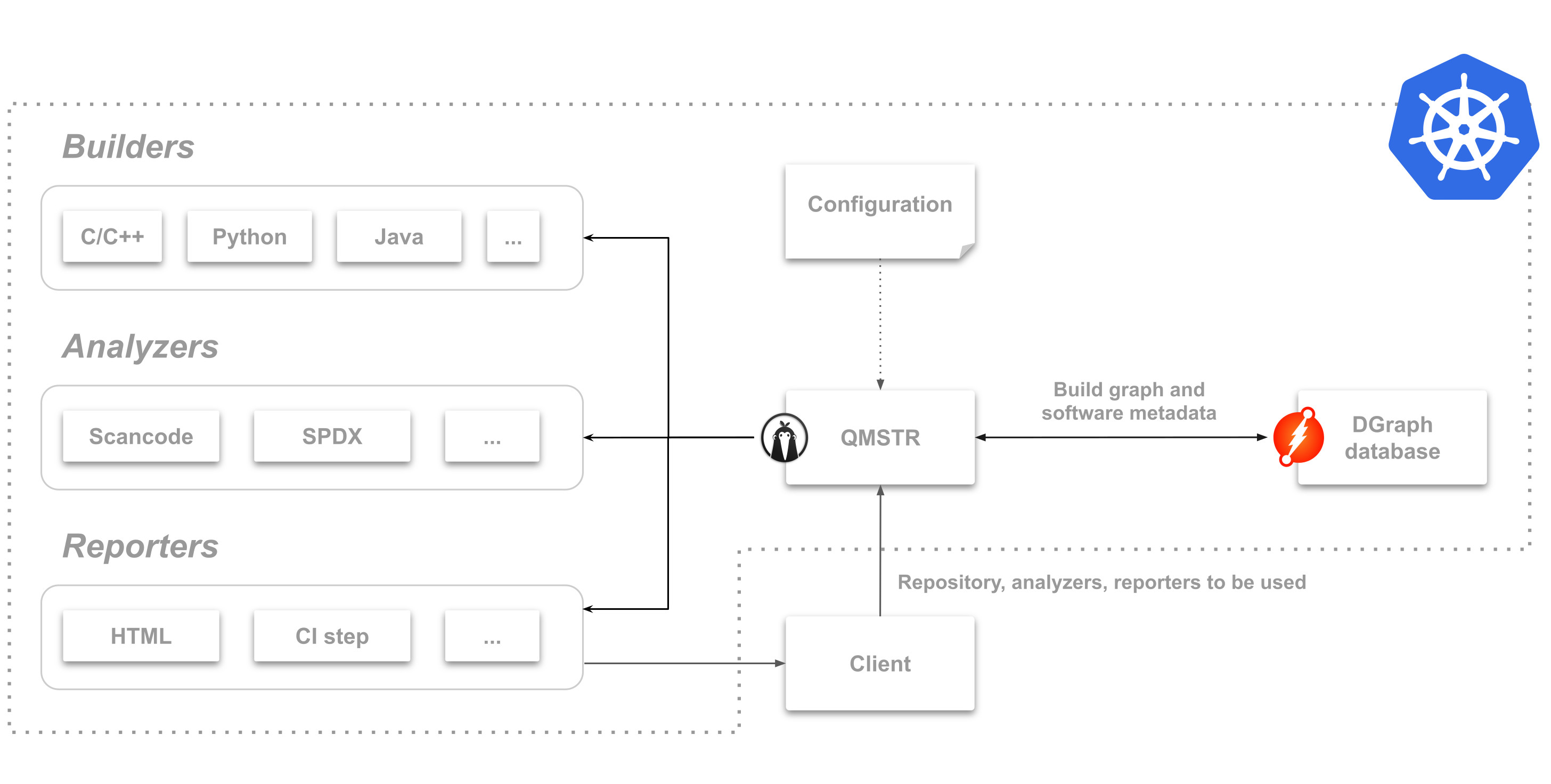 initContainers and aStatefulSetfor our DGraph database, Quartermaster runs its entire logic in two containers:qmstr-clientcontainer: it executes commands according to the Quartermaster's workflow.It is in charge of starting the so-called phases (e.g., build, analysis, etc.).
