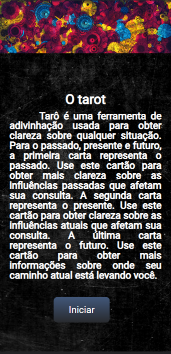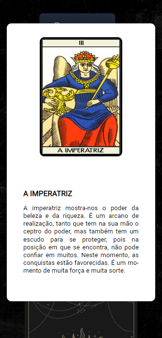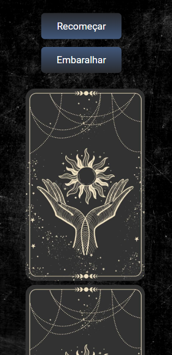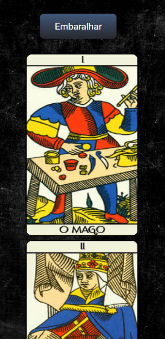 OBS: As imagens e nomes das cartas estão listadas no arquivo tarot.json, esse arquivo deve ser consumido via http request. A propriedade image de cada carta deve ser concatenada com a propriedade imagesUrl, para obter o endereço final da imagem. Utilize o valor da propriedade imageBackCard para obter a imagem do fundo da carta.