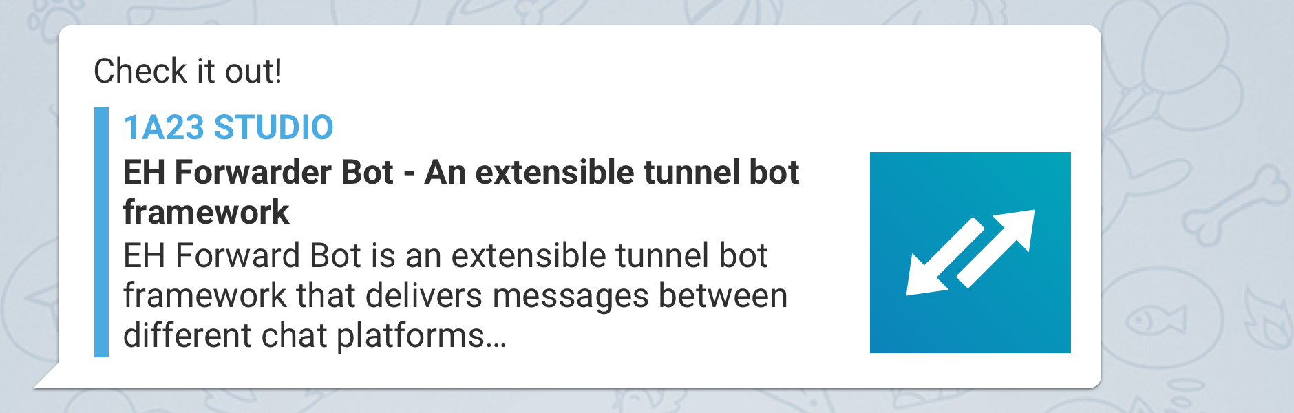 Codename EH Forwarder Bot (EFB) is an extensible chat tunnel framework which allows users to contact people from other chat platforms, and ultimately remotely control their accounts in other platforms.