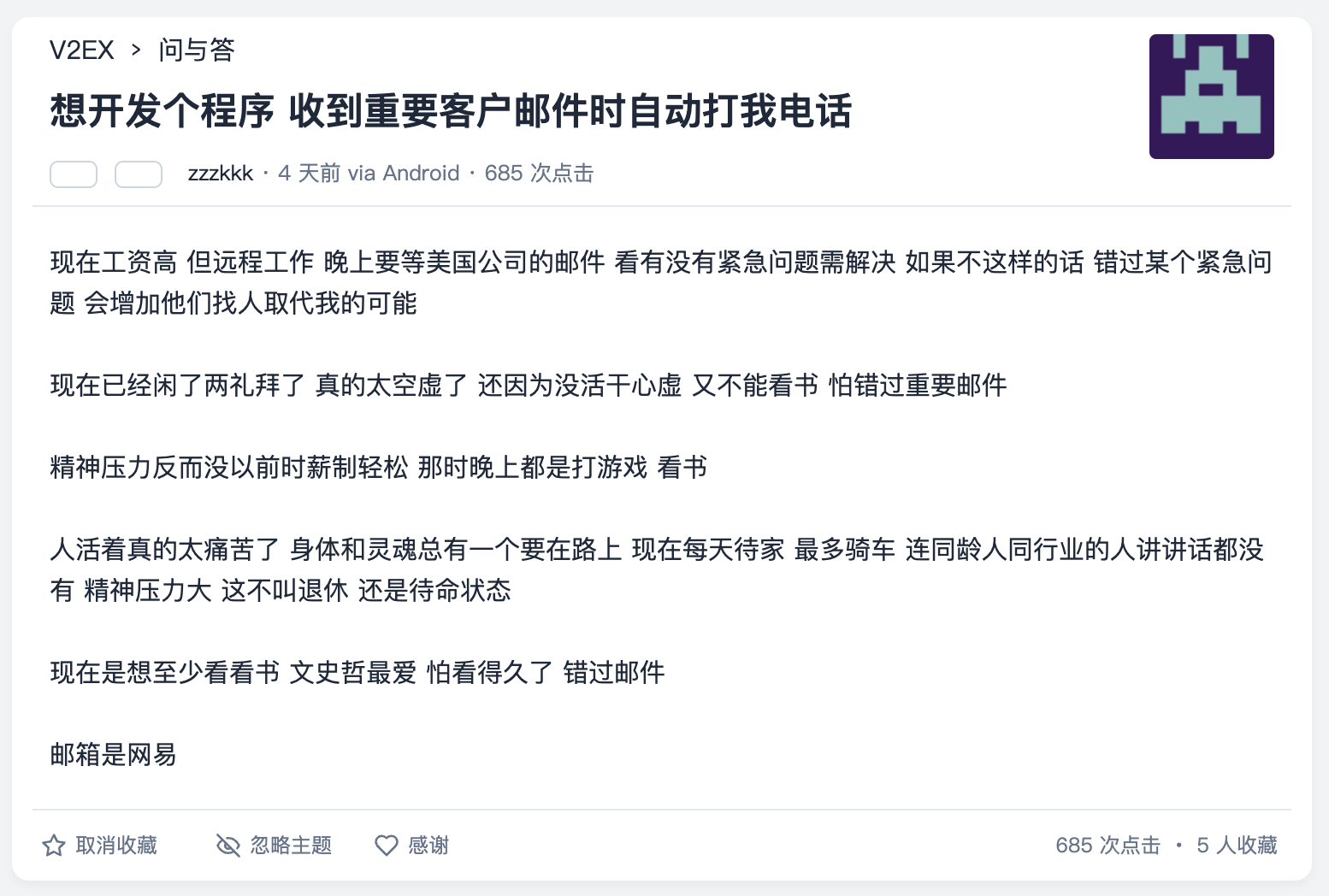 写 Mango 的起因是一天在 V2EX 上看到了这个帖子,有朋友问有没有方法让邮箱收到一些特定的邮件之后给他打电话,这样就不会错过重要信息了。毕竟有时候沉浸在眼前的事情里,确实很难注意到有未读邮件。
