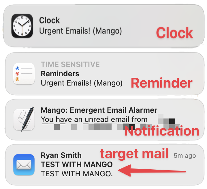 这是 Mango 最核心的功能。首先,当一个特定邮件地址发来邮件且被 Mango 发现后,Mango 会弹出 Notification(会在右上角显示)。接着,Mango 会使用 Shortcuts 来设置两个提醒项,一个是闹钟,另一个是提醒。闹钟是 macOS13 上才有的功能。Mango 会设置一个 5 分钟后的闹钟,提醒用户查看。同样地,此时 Mango 还会同时设置一个 5 分钟后的提醒,届时用户不仅可以在 Mac 上看到提醒,还可以在 iPhone、iPad 以及 AppleWatch 上同步收到提示。因此,如果用户此刻并没有在电脑前,Mango 也能通过跨平台同步消息提醒到用户。当然,这一切都有赖于 Shortcuts 脚本,用户也可以在给定脚本中自定义闹钟提醒的间隔时长,以及有何种方式呈现提醒。如果修改了脚本的名称,记得在设置的最后一项填入修改后的名称,保存即可。