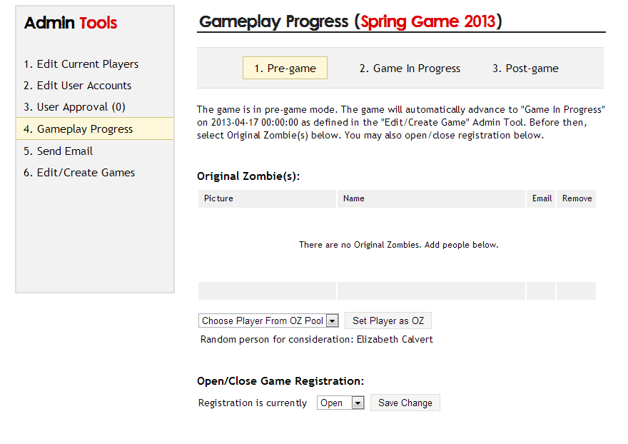 The game is in "pre game" mode. During this time, players can sign up and join the upcoming game. They can get their code and opt-into the Original Zombie pool if they'd like. Moderators can approve players, mark players having attended an orientation, send out email, and choose original zombies.