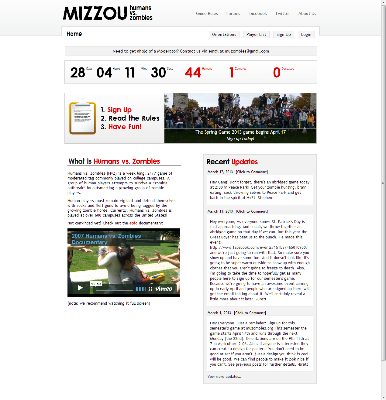 Running the game at the University of Missouri, we indentified several flaws around the game and engine that could be rectified with an improved game engine. This engine introduces several features that assist in running a Humans vs. Zombies game from a player standpoint and a moderator (admin) standpoint.