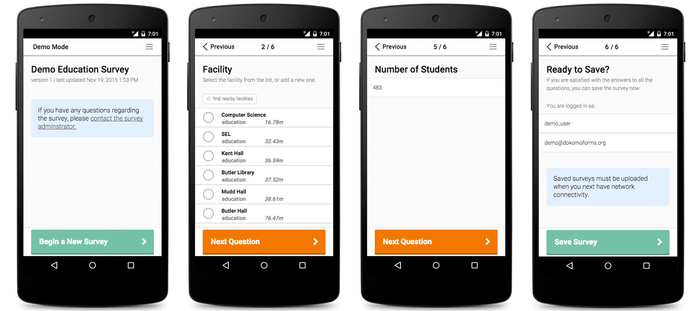Dokomo strives to simplify the process by integrating the elements of a data collection effort into a unified system, from creation of mobile-ready surveys to quick analysis and visualization of the collected data.