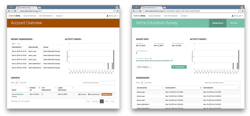 As an adminstrator of a surveying effort, it's important to know where, when, and by whom data is being submitted. Dokomo Forms lets administrators quickly see the current progress of an effort, providing a quick list and map of the latest submissions and a graph showing submissions/day for the recent past.