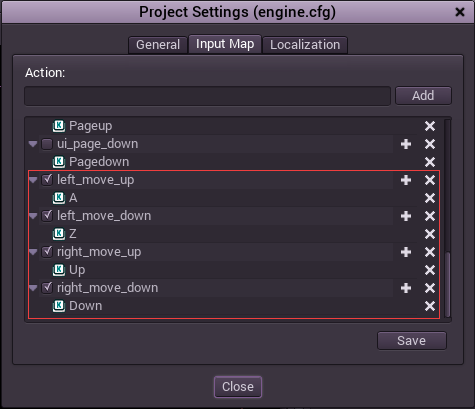 Open the project properties dialog again, but this time move to the "Input Map" tab. On it, add 4 actions: "left_move_up","left_move_down","right_move_up","right_move_down". Assign the keys that you desire. A/Z for left and Up/Down as keys should work in most cases.