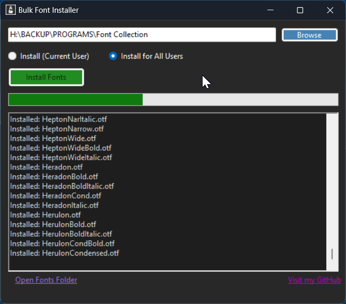 Bulk Font Installer is a simple Windows tool designed to install multiple fonts at once with just a few clicks. Perfect for designers, developers, or anyone who wants to quickly populate their system with a large number of fonts.