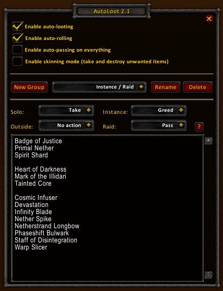 You create groups of items, and each group is set to handle looting/rolling for all the items in it. You'll probably have a group of things you always want to take, like badges of justice and quest items. If you keep adding groups/items/rules, then eventually you'll never have to manually loot/roll again, unless you're the unlucky loot master.
