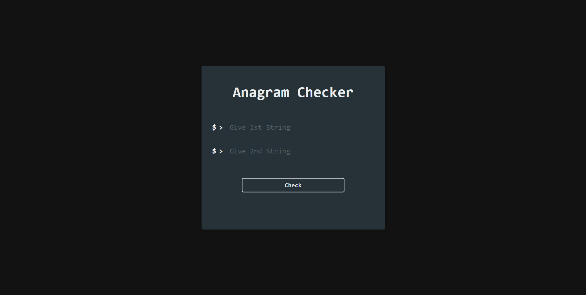 Now open the index.html file with any browser and you will get the following UI. Here you can give two strings and pressing enter or pressing the button, you can check whether the given strings are anagram or not.