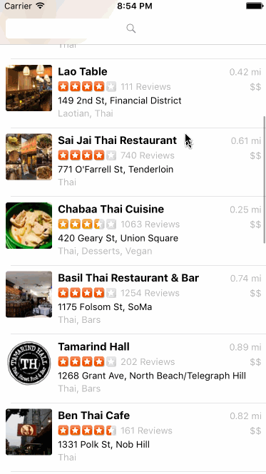 - Search bar should be in the navigation bar (doesn't have to expand to show location like the real Yelp app does).