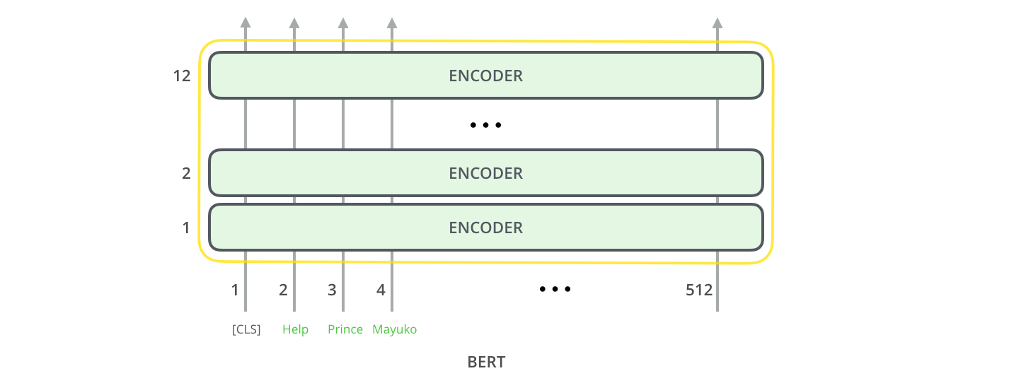 Just like the vanilla encoder of the transformer, BERT takes a sequence of words as input which keep flowing up the stack. Each layer applies self-attention, and passes its results through a feed-forward network, and then hands it off to the next encoder.