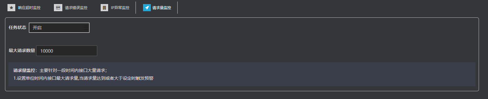 预防短时间内接口新增大量的请求,造成系统异常,设置 单位时间 请求量为100000,当请求量达到这个值触发预警