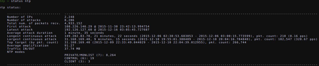 These modes were chosen because they are the ones most utilized in amplification-based DDoS attacks on NTP (mode 6 and 7), and client mode was implemented in order to make the service look more realistic.