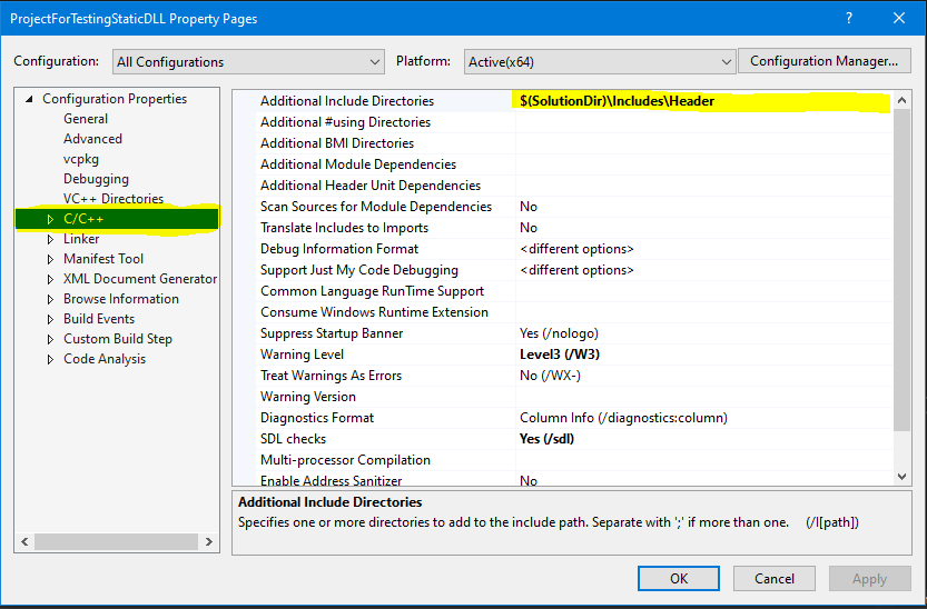 - Click on "C/C++" (Highlighted yellow), now copy this "$(SolutionDir)\Includes\Header" into the "Additional Include Directories" (Highlighted yellow)
