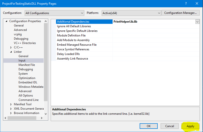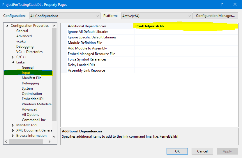 - Click at the left side of "Linker" to expaned it, now click on "Input" (Highlighted yellow), now copy this "PrintHelperLib.lib" into "Additional Dependencies" (Highlighted yellow)