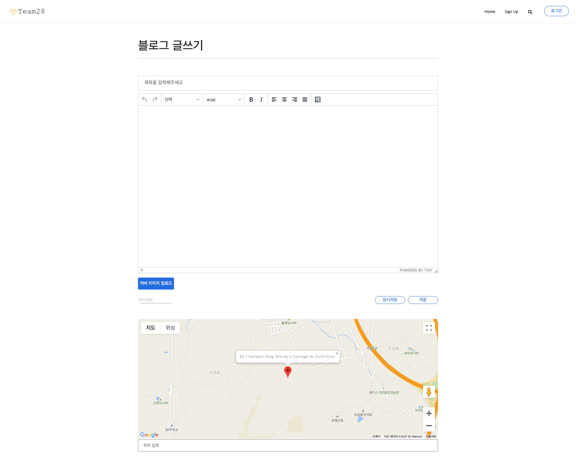 제목, 본문, 썸네일, 임시저장, 저장, 구글맵으로 이루어져 있습니다.