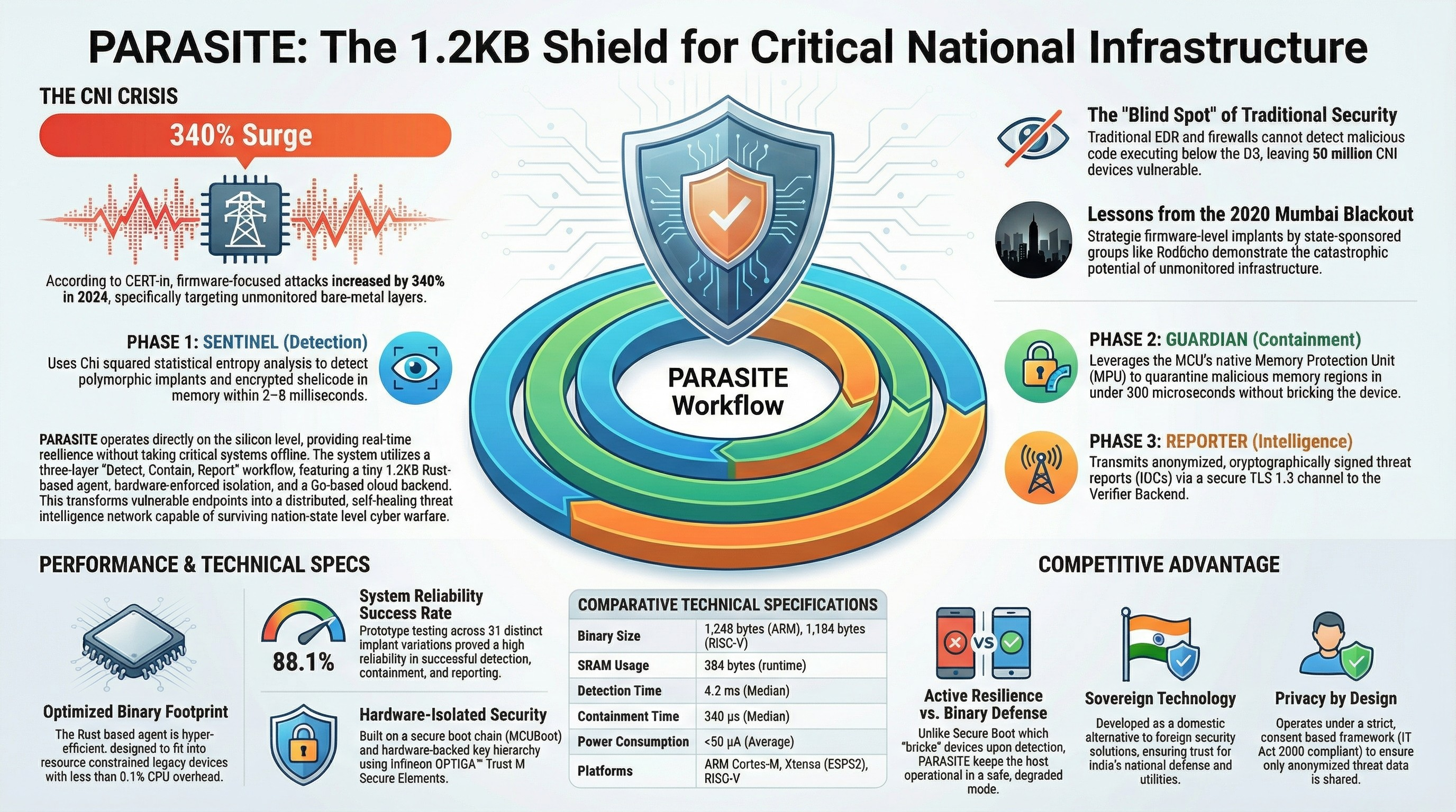 PARASITE is a complete, end-to-end security ecosystem designed to protect the firmware of embedded systems within Critical National Infrastructure (CNI). It features a hyper-efficient, 1.2KB on-device agent that provides real-time threat detection, hardware-enforced containment, and cryptographically secure reporting to a scalable cloud backend.