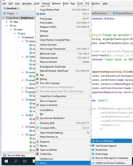 - Open IntelliJ, right click on your project directory, choose Azure -> Run on Web App.