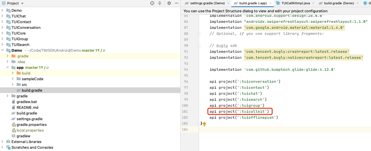 If you do not need the audio/video call feature, you only delete the audio/video call integration code as shown in the figure below from the build.gradle
