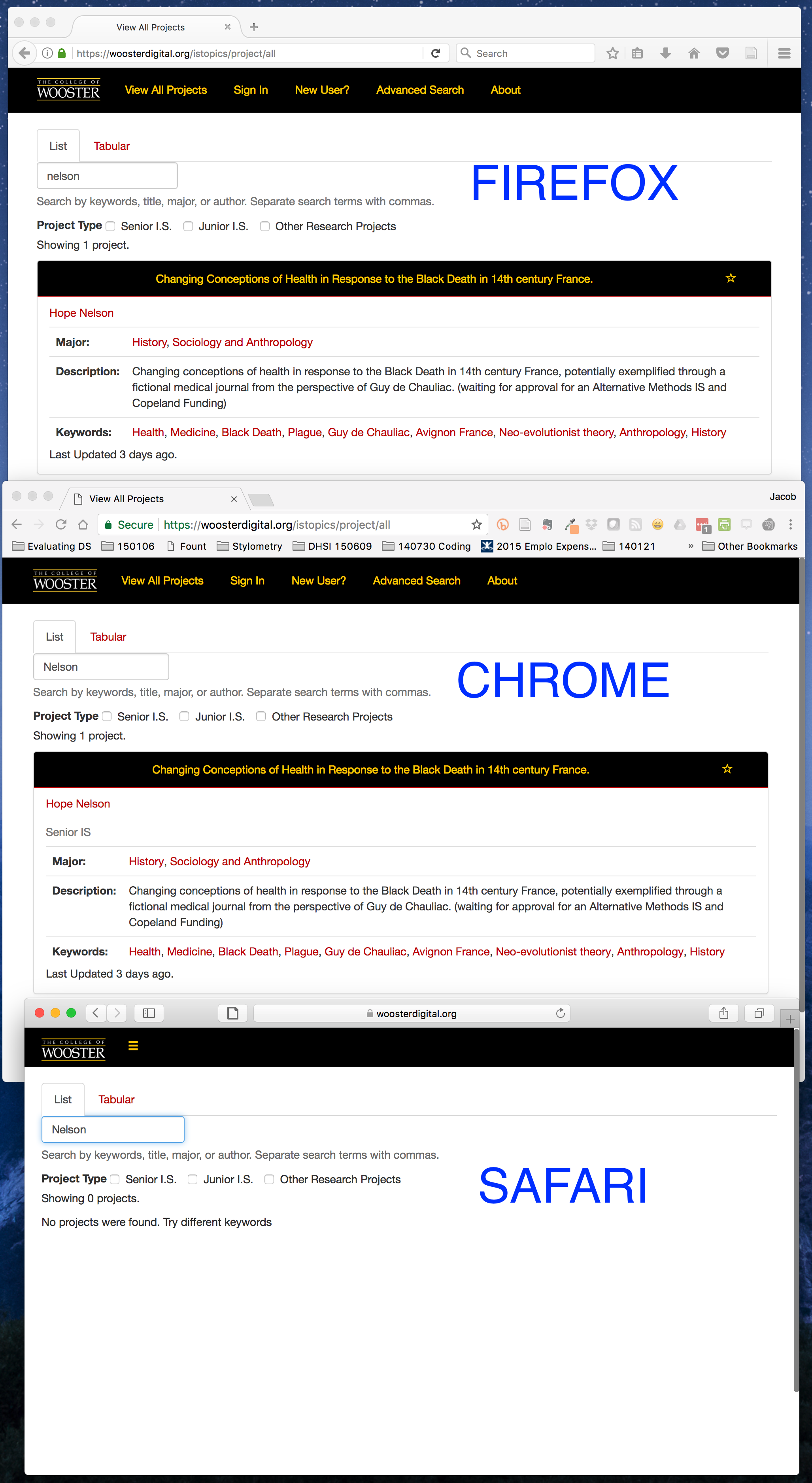 Tested in Firefox and Chrome, both work fine. Search just not working in Safari. I noticed this on a classroom machine, tested with my own. My machine is MBP running El Capitan. Classroom machine was a Mac Mini, not sure about the OS though.