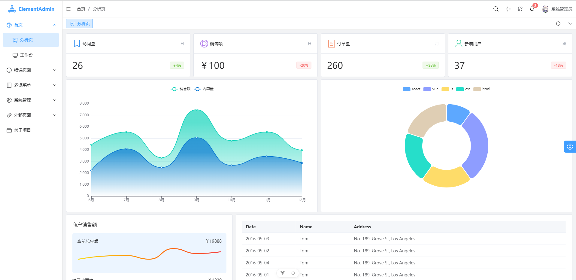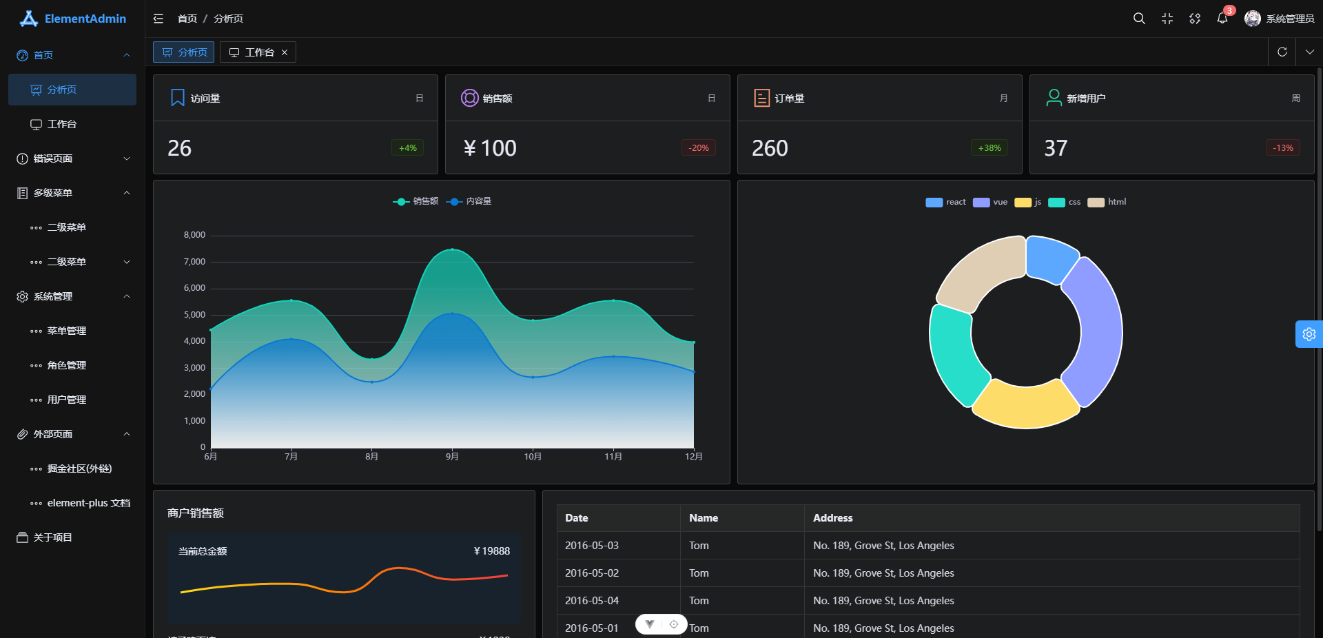 ElementAdmin 是一个基于 Vue3、Vite、TypeScript、Unocss、Element plus、Pinia、VueUse 的后台模版,它使用了最新的前端技术栈,内置主题配置、动态菜单、权限校验等,基于 mock 实现的动态数据展示,可以当作开箱的模板,也可用于学习参考。