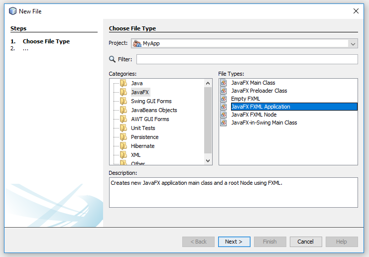 <fx:root id="AnchorPane" prefHeight="200.0" prefWidth="200.0" type="AnchorPane" xmlns:fx="http://javafx.com/fxml/1" />Creating a JavaFX FXML Application with the name MyApp will create similar files, with an additional main class: